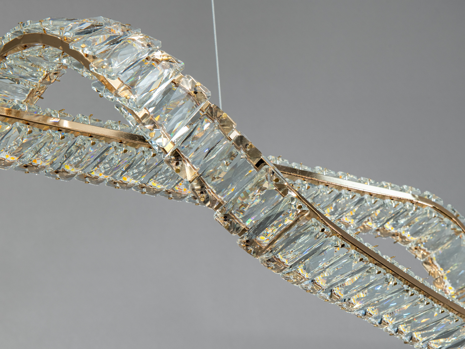 Ця люстра підходить для просторих приміщень, таких як вітальні, їдальні або кабінети. Вигнута форма конструкції та кристалічні елементи створюють унікальні світлові ефекти, підкреслюючи сучасний стиль інтер'єру.