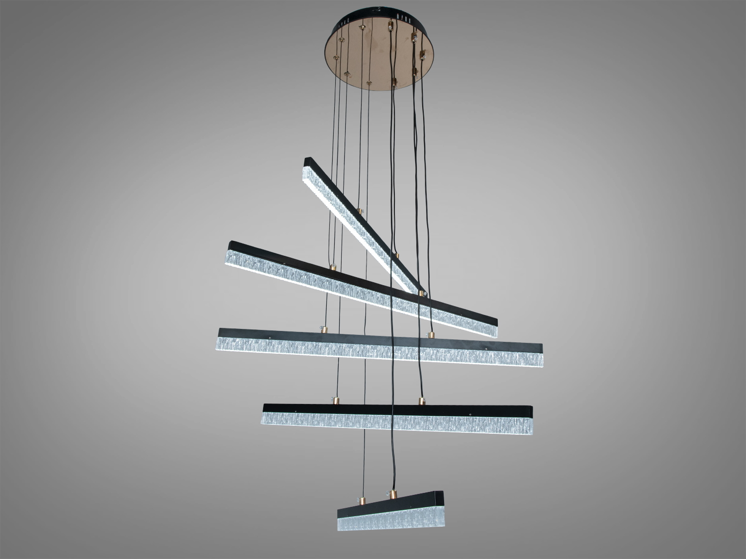 Підвісна LED люстра з п’ятьма горизонтальними панелями створює багаторівневу світлову композицію, яка забезпечує м’яке та рівномірне освітлення кімнати площею до 12 м². Чорний колір корпусу та підвісів додає графічності та сучасності інтер’єру, а акрилові розсіювачі гарантують відсутність відблисків і комфортний світловий потік.