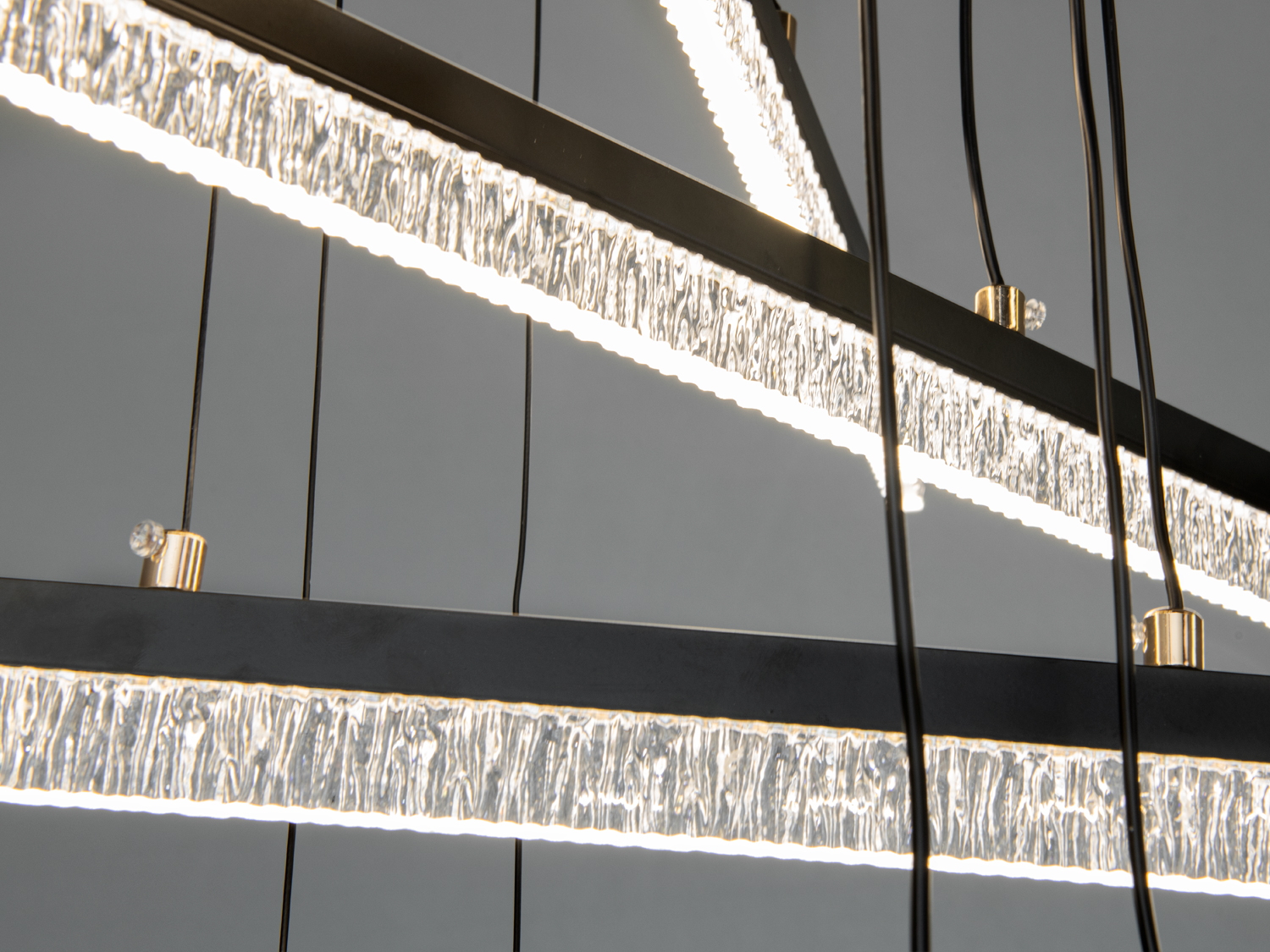 Конструкція складається з п’яти лінійних LED-панелей, підвішених на тонких чорних дротах на п’яти різних рівнях, що створює глибину та виразність простору. Металева база забезпечує надійне кріплення, а акрилові елементи додають легкості формі.