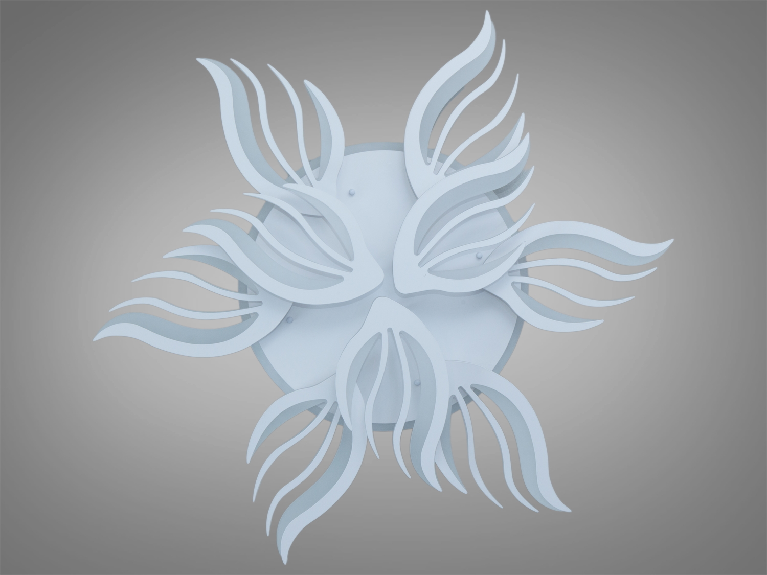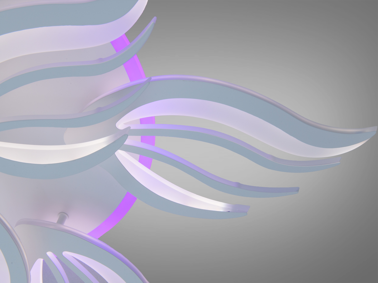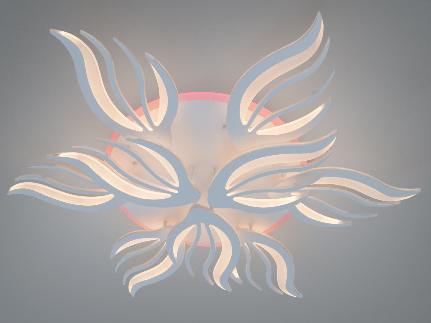 Характерний дизайн у вигляді хвилястих елементів, що нагадують пелюстки або полум'я, надає люстрі динамічності і виразності. Білий колір корпусу й акрилові розсіювальні елементи забезпечують рівномірний розподіл світла без різких тіней.