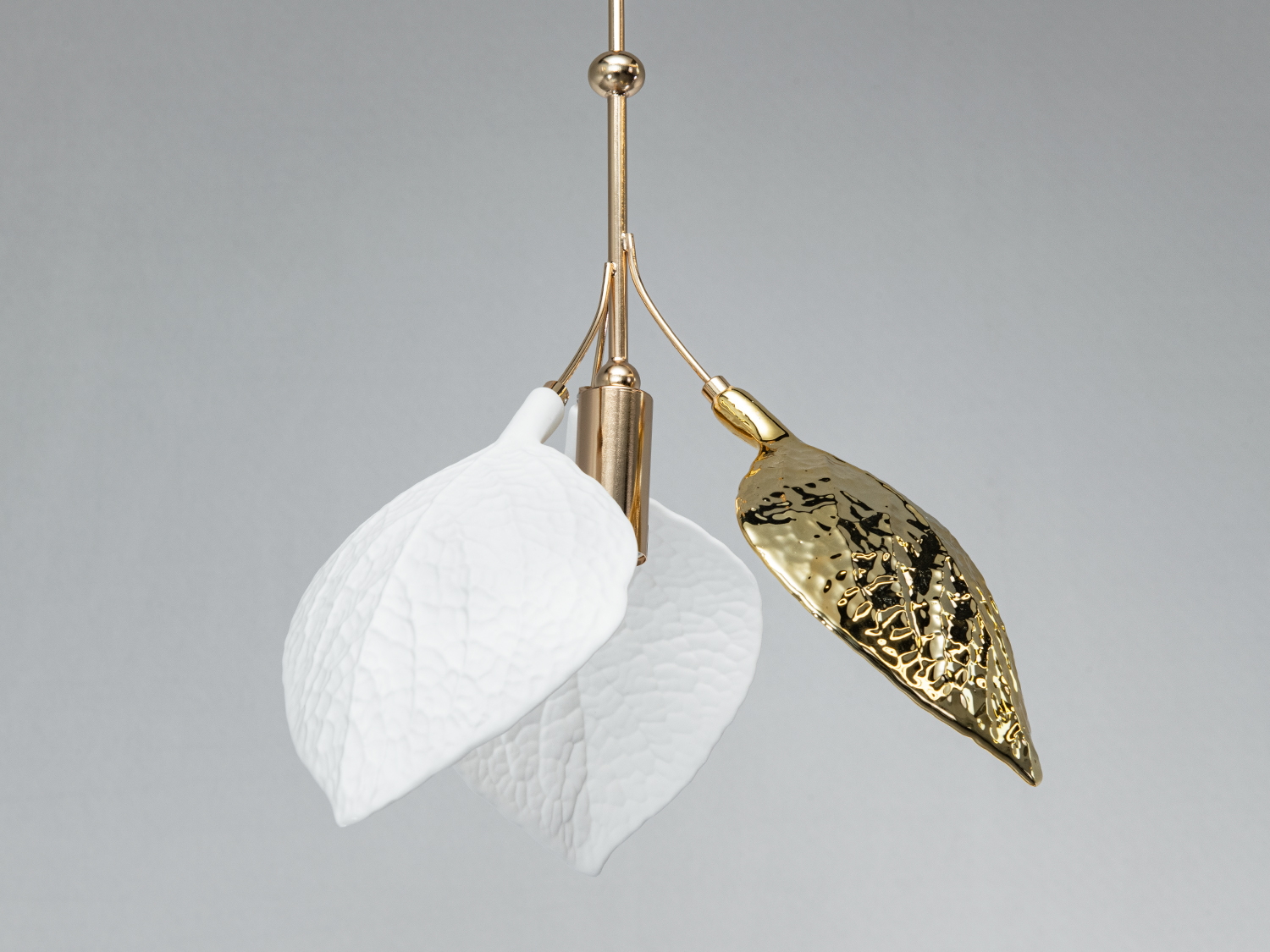 Унікальний дизайн світильника відзначається білими керамічними пелюстками, що м’яко розсіюють світло, та одним металевим листком з золотистим покриттям, який додає теплого акценту. Композиція нагадує гілочку з листям, що гармонійно вписується у сучасні, скандинавські та екоінтер’єри.