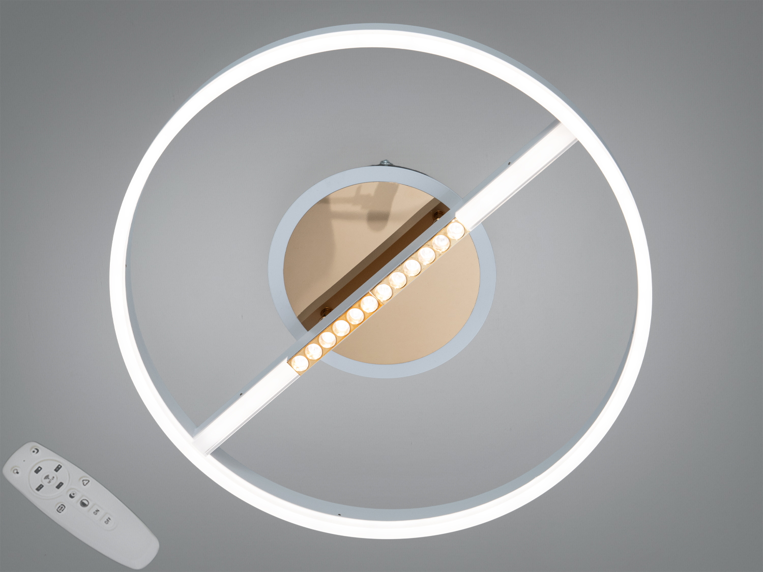 Стельова LED люстра Diasha — це поєднання сучасного дизайну та функціональності. Біло-золотий корпус з вбудованим LED підсвічуванням потужністю 48 Вт забезпечує м'яке і рівномірне освітлення для приміщень площею до 16 м². Центральна частина з золотими елементами додає теплоти і гармонійно вписується в різні інтер'єри.