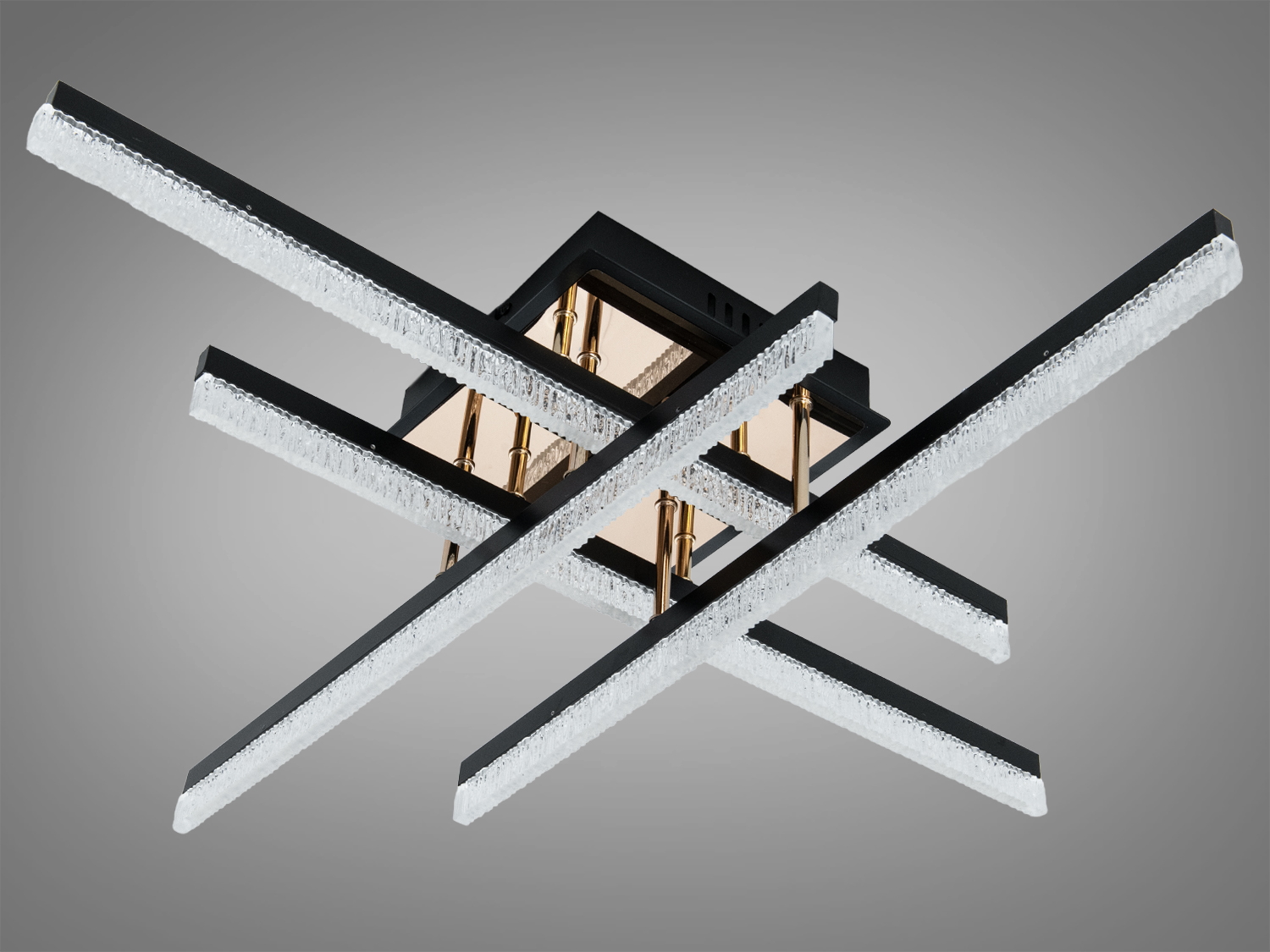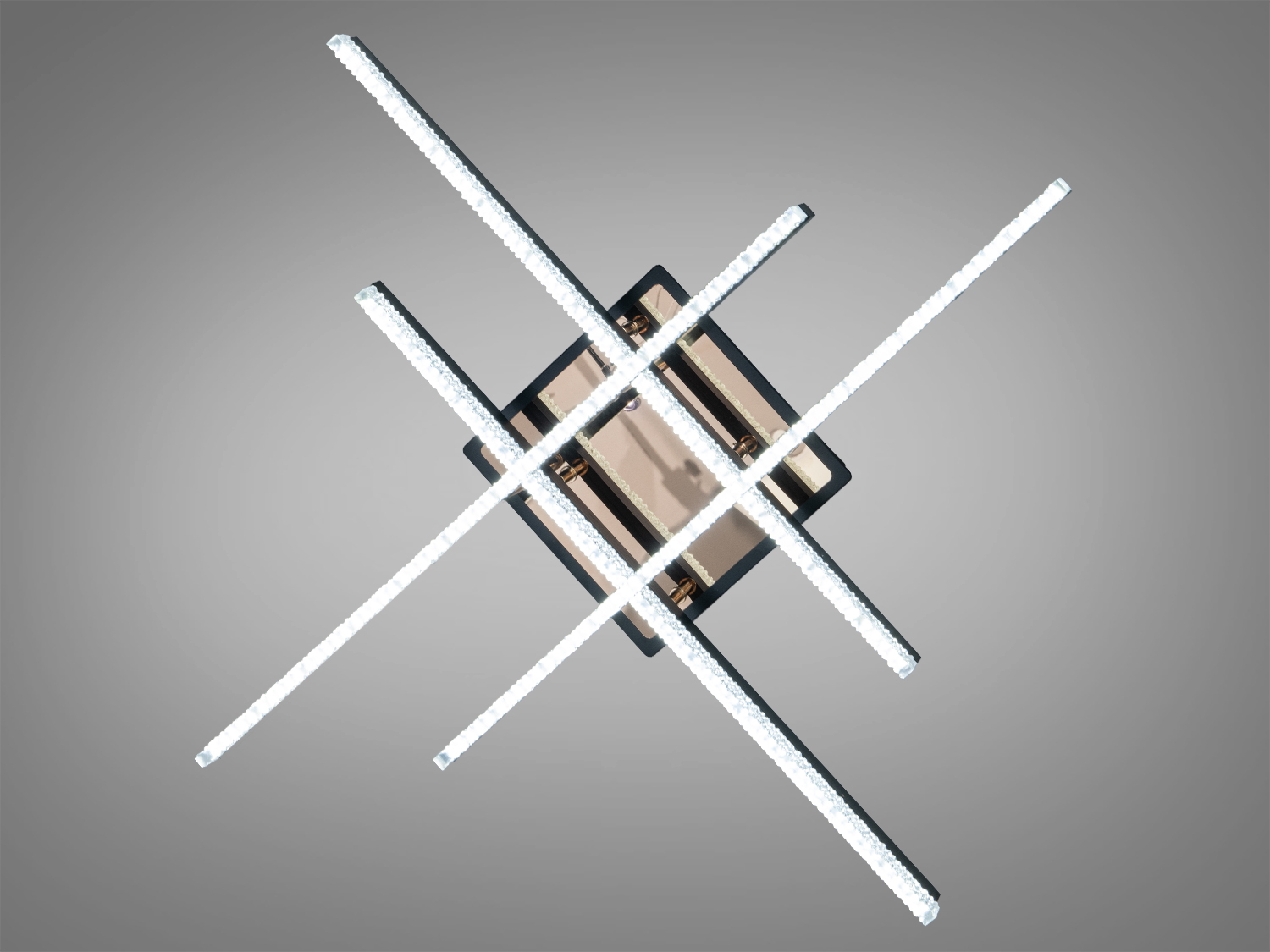 Конструкція складається з чотирьох LED-смуг, розташованих хрест-навхрест, що формують впізнаваний силует і забезпечують рівномірне світлове поле. Матове чорне покриття металевого корпусу та прозорі акрилові розсіювачі пом'якшують світловий потік, знижуючи яскраві точки світлодіодів.