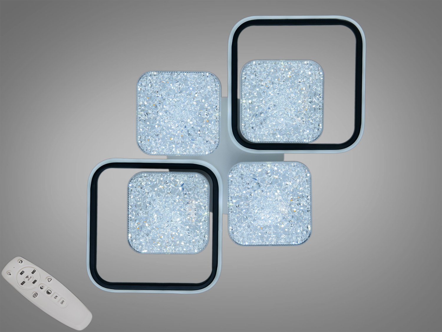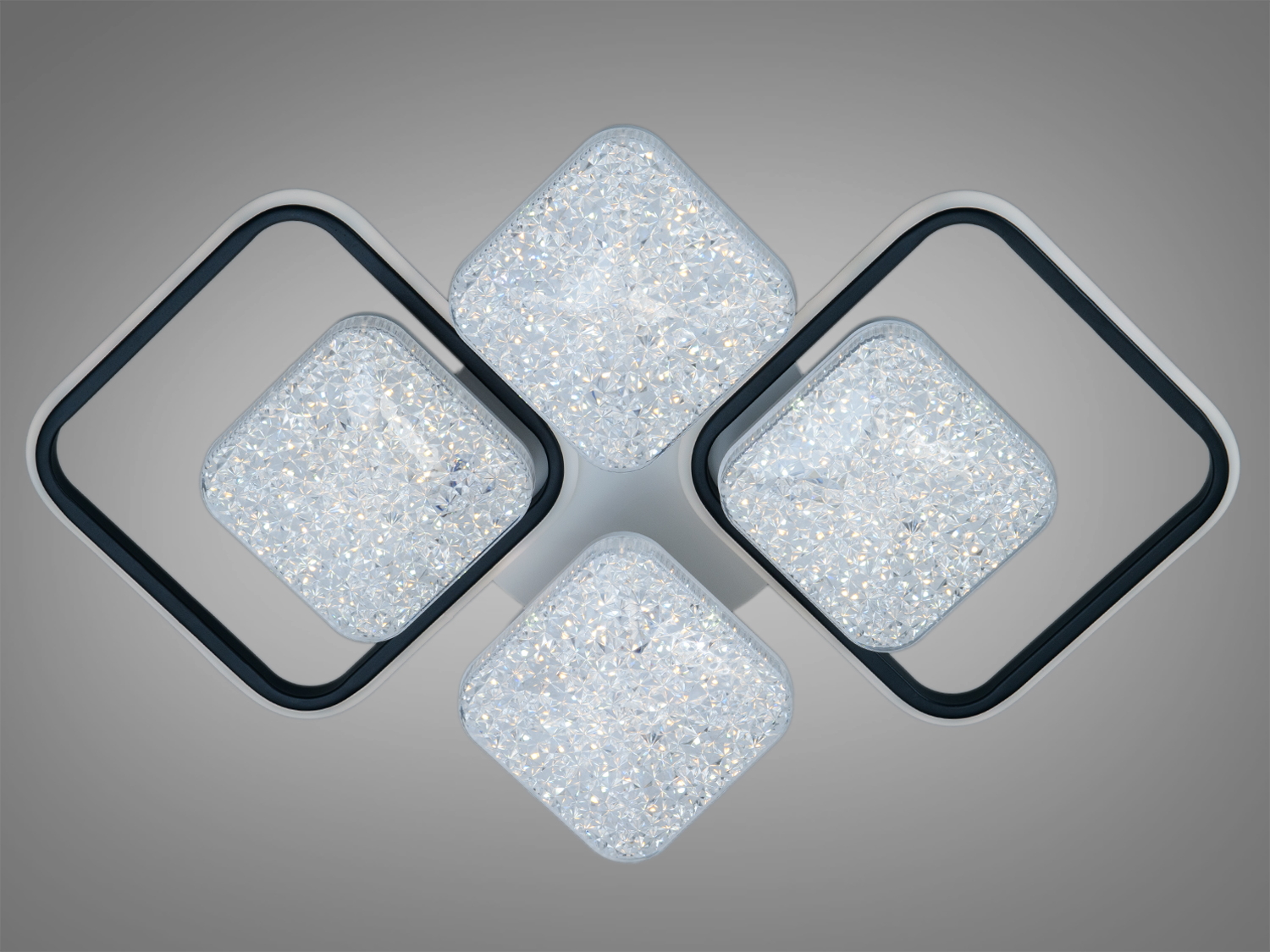 Люстра оснащена чотирма квадратними модулями, які забезпечують рівномірний розподіл світла та створюють цікавий геометричний дизайн. Акрилові розсіювачі з кристалічною текстурою роблять освітлення м'яким, знижуючи сліпуче дію.