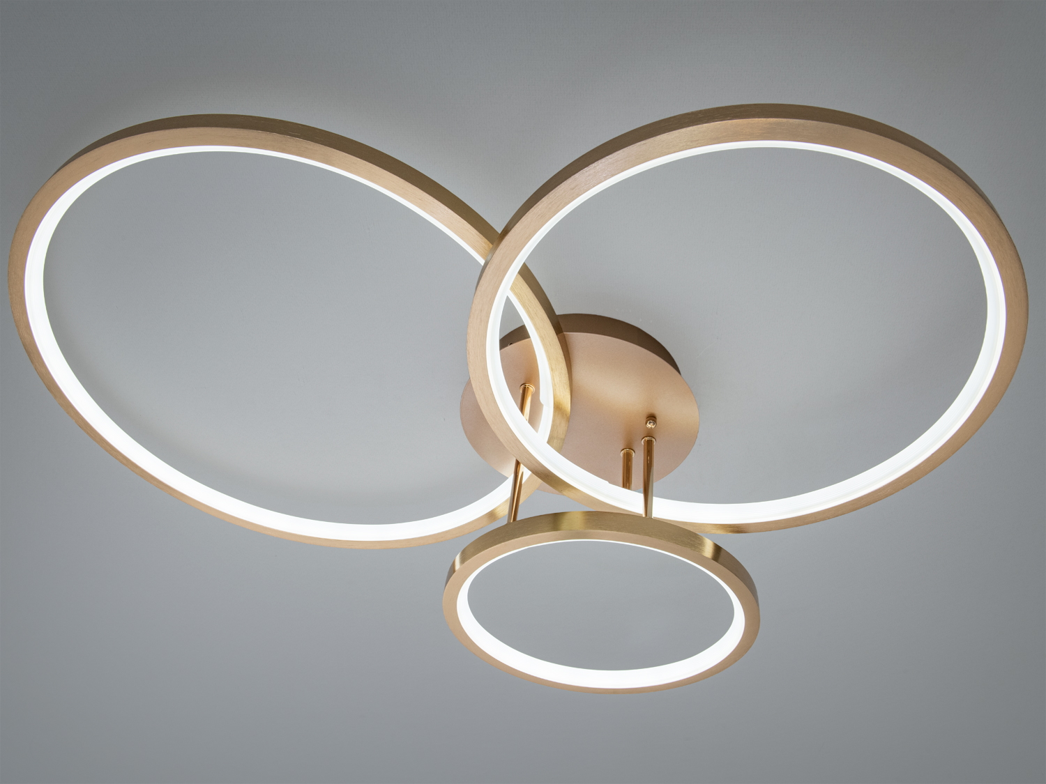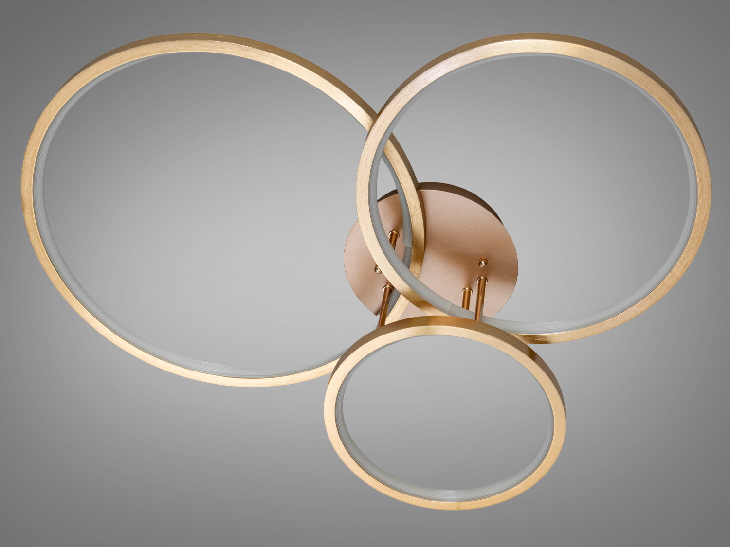 Конструкція з трьох круглих світлодіодних кілець забезпечує рівномірне розсіяне освітлення, уникаючи різких тіней. Золоте покриття додає тепла та гармонійно поєднується з різними матеріалами інтер'єру, такими як дерево, камінь і текстиль.
