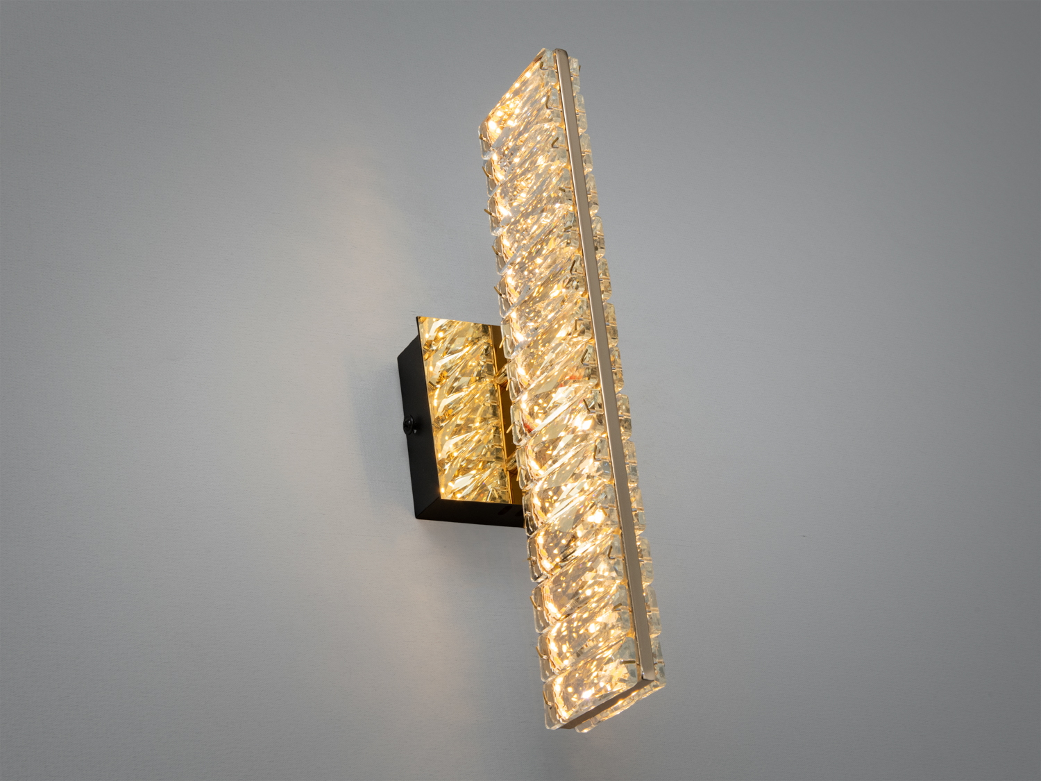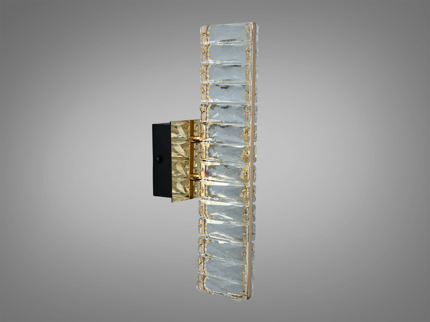 Металевий каркас із золотим покриттям гармонійно поєднується з прозорими кришталевими елементами, створюючи привабливий декоративний ефект. Таке бра прекрасно доповнить інтер'єри в стилі модерн, мінімалізм або арт-деко.