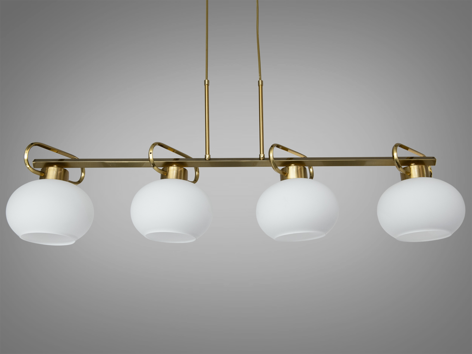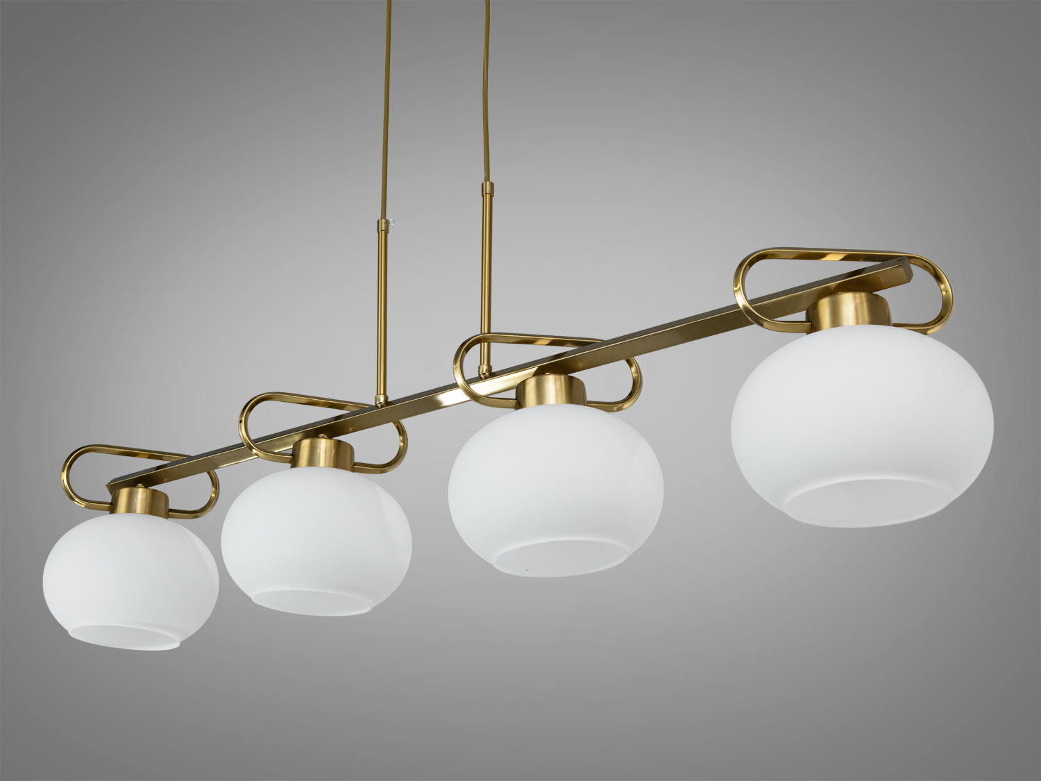 Лінійна форма люстри з чотирма плафонами забезпечує рівномірний розподіл світла над довгими столами та робочими поверхнями. Бронзова основа надає виробу теплоту, прекрасно поєднується з дерев'яною та кам'яною обробкою.