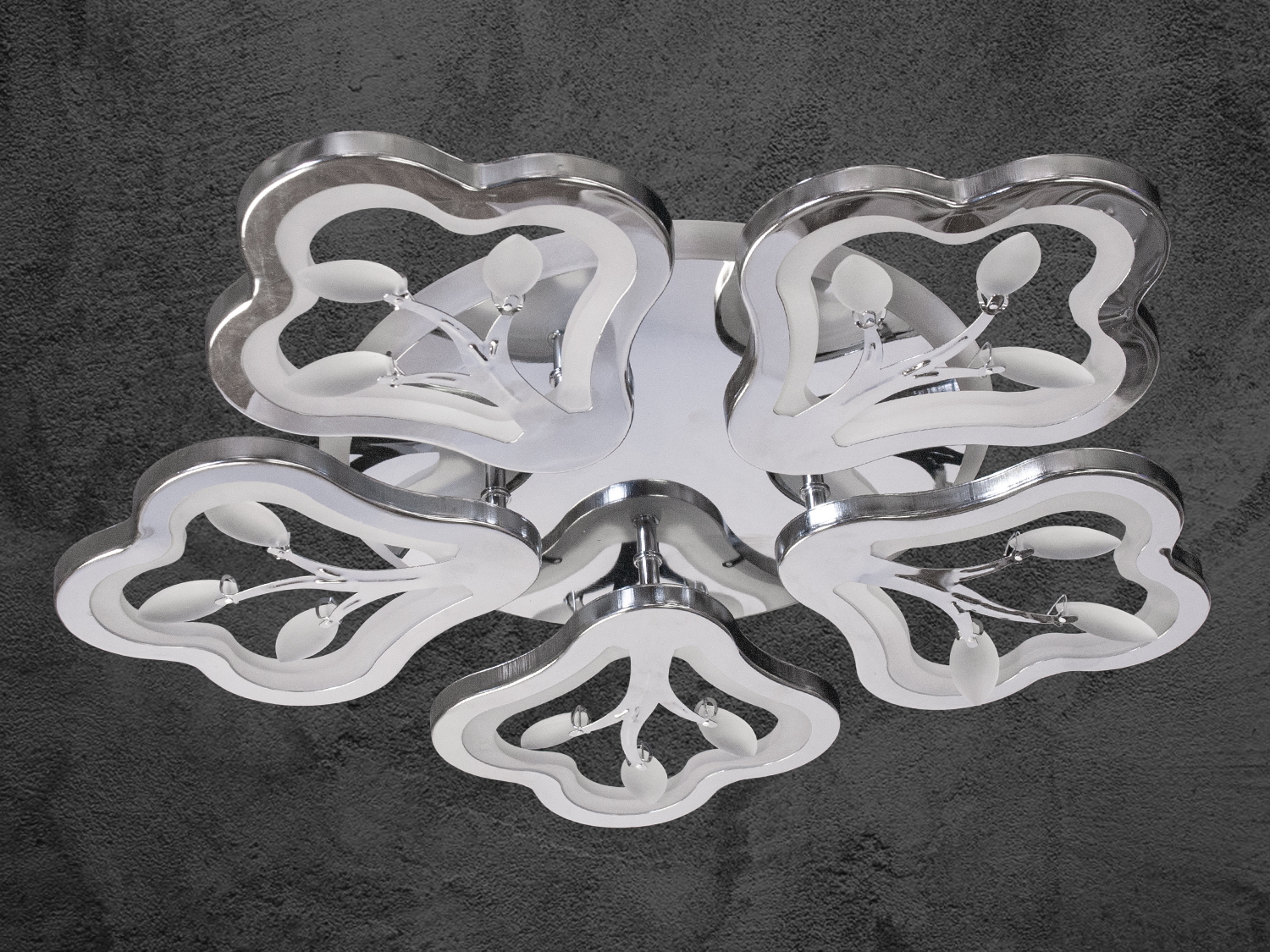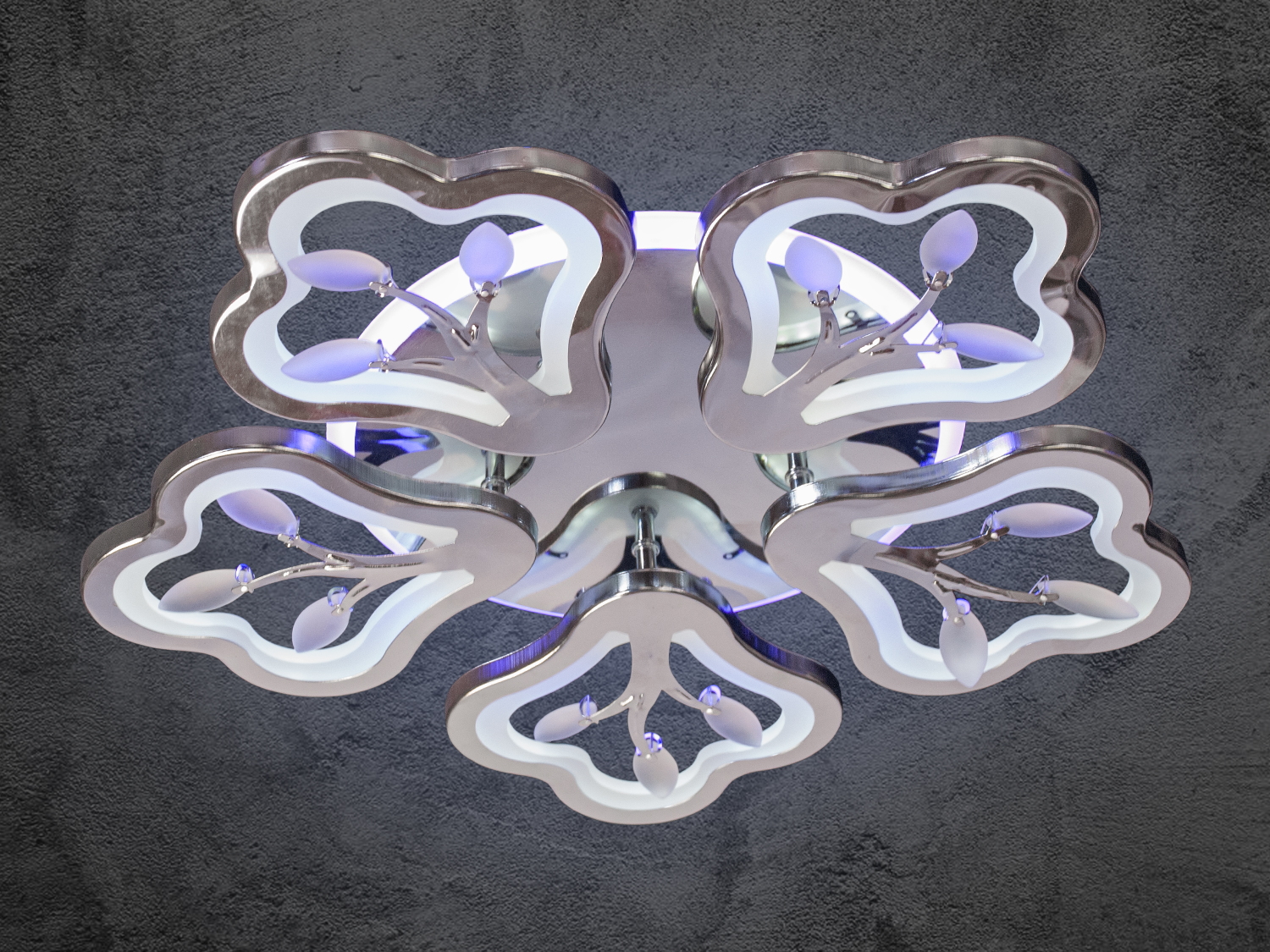 Ця стельова LED люстра потужністю 135 Вт підходить для освітлення приміщень площею до 23 м². Дизайн у формі квітки з п'ятьма світловими модулями рівномірно розподіляє світло, створюючи комфортну атмосферу без різких тіней.