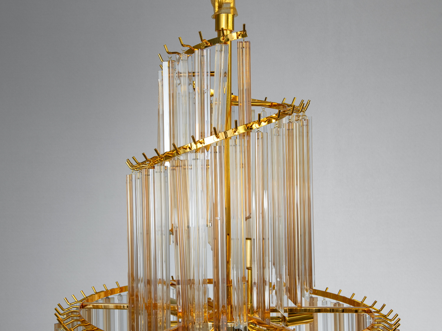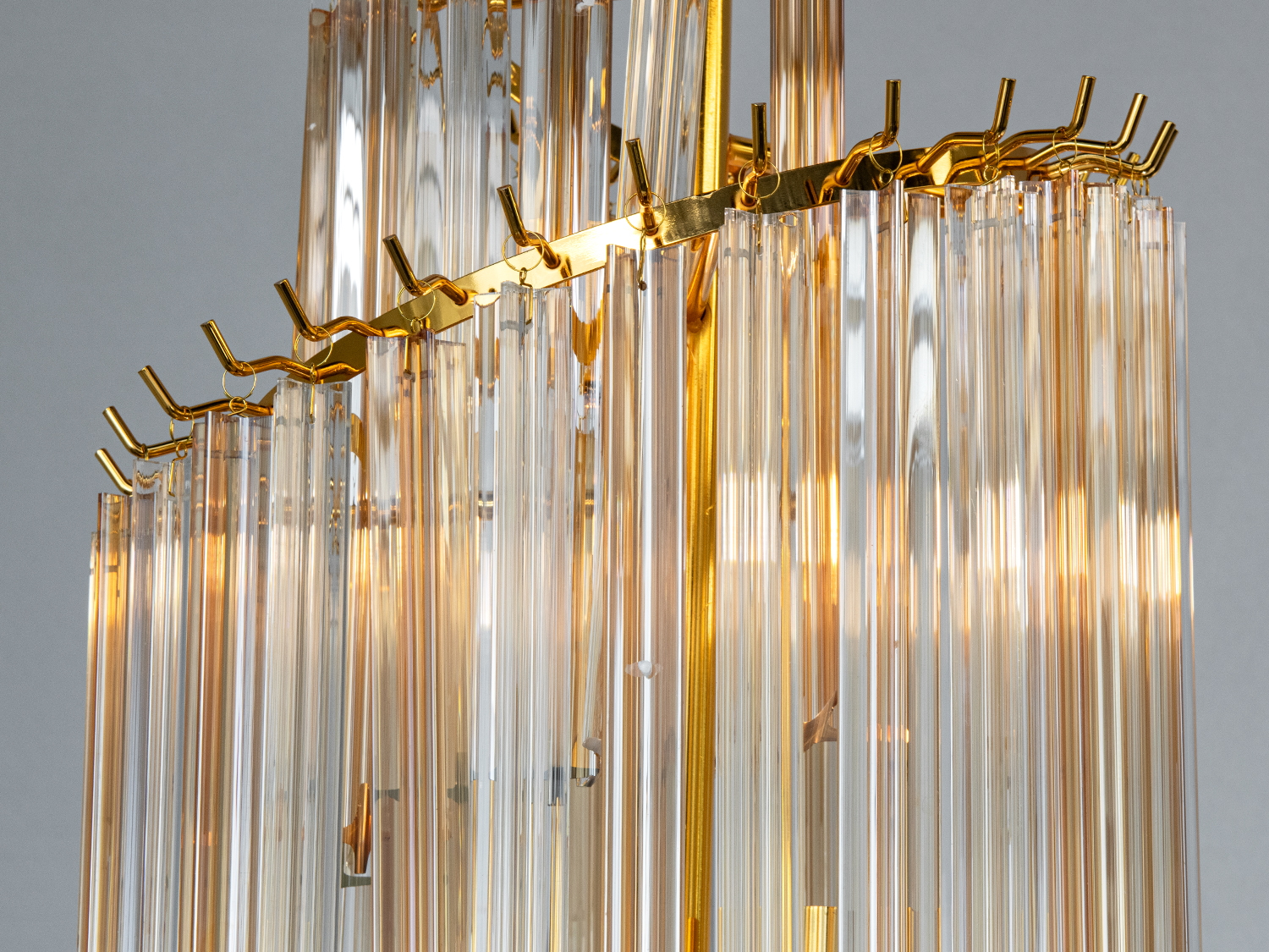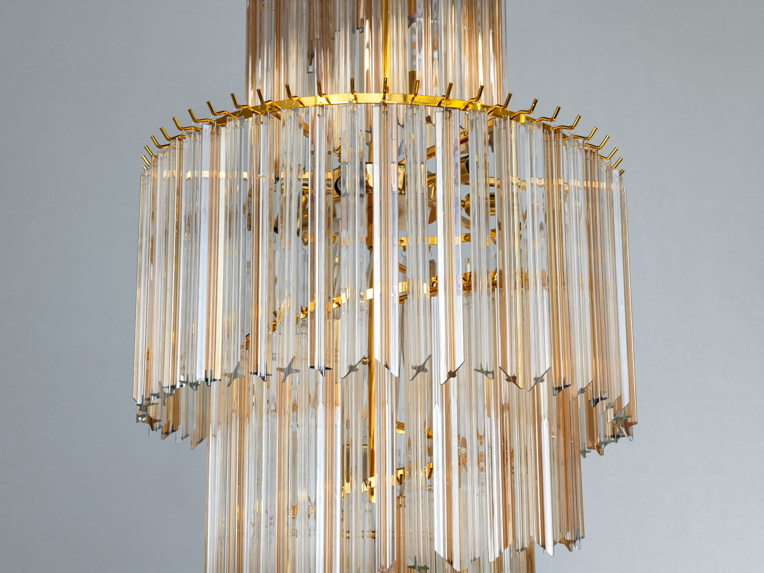 Золотисті елементи фурнітури надають люстрі вишуканості та тепла, підсилюючи глибину кришталевих граней. Металевий каркас і скляні підвіски виконані з застосуванням гальванічного покриття, що робить люстру стійкою до зовнішніх впливів.