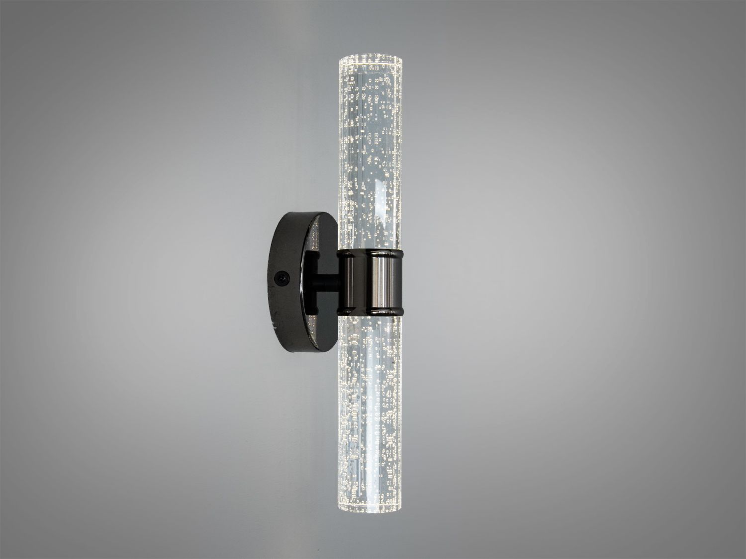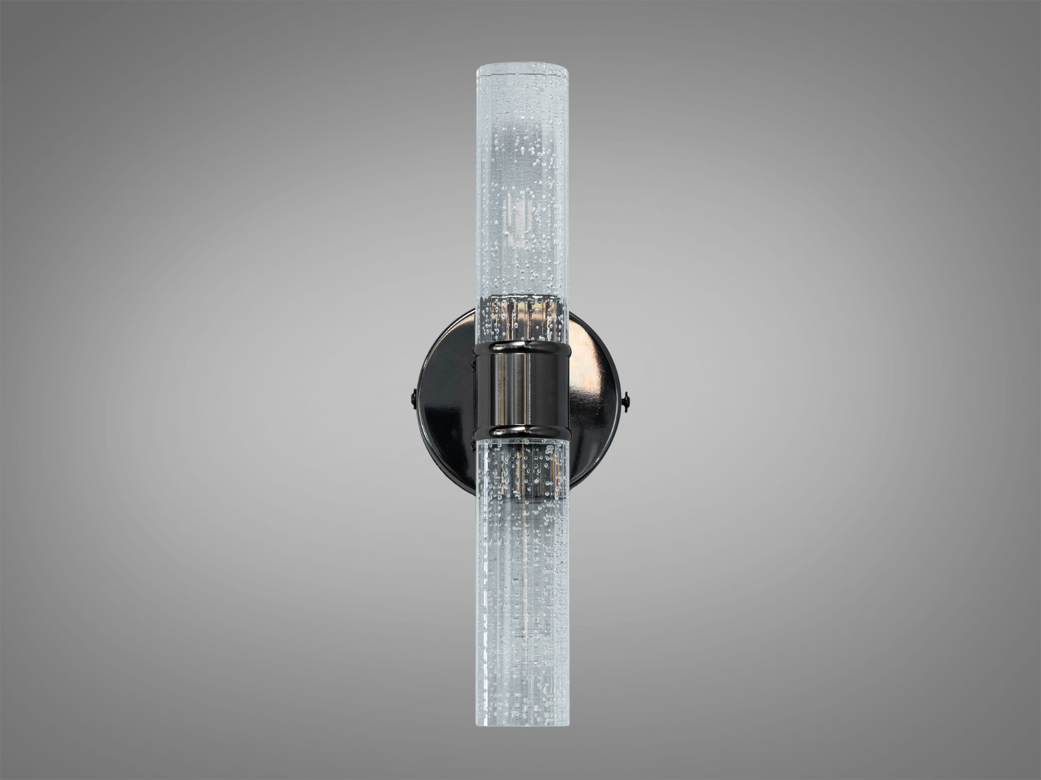 Корпус світильника виконаний з металу, а плафон зі скла з декоративними бульбашками, що створюють м'яке мерехтіння. Чорний хром підкреслює мінімалістичний стиль і гармонійно поєднується з іншими елементами інтер'єру.