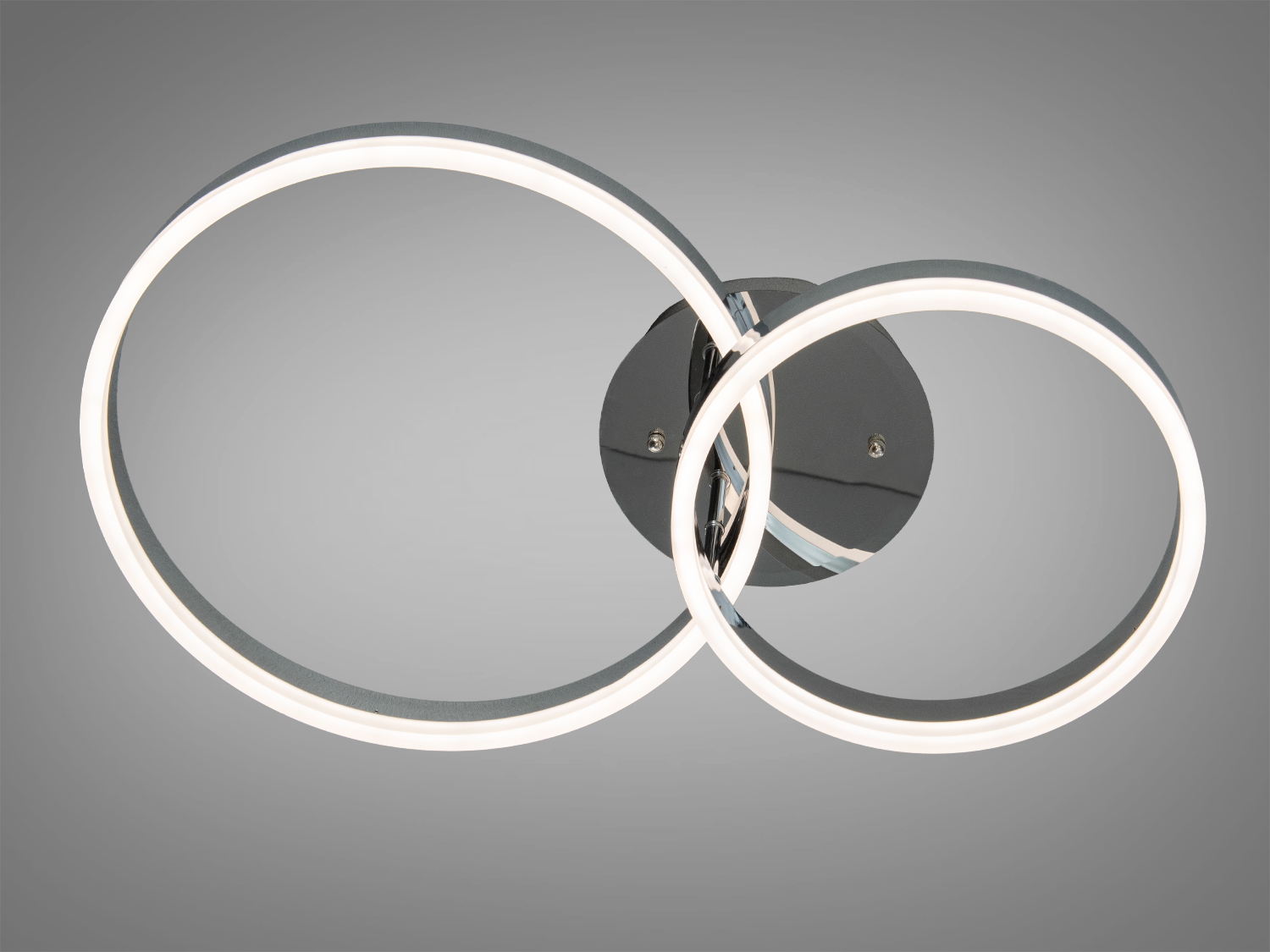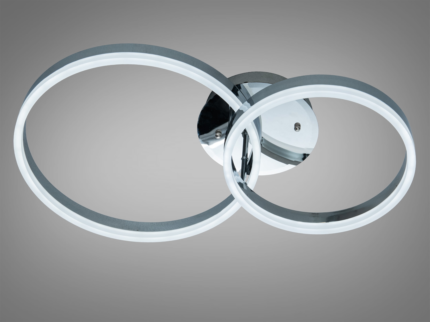 Потолочна LED люстра з двома перетинаючимися кільцями в хромованому виконанні — це практичне та стильне рішення для освітлення сучасних приміщень.
