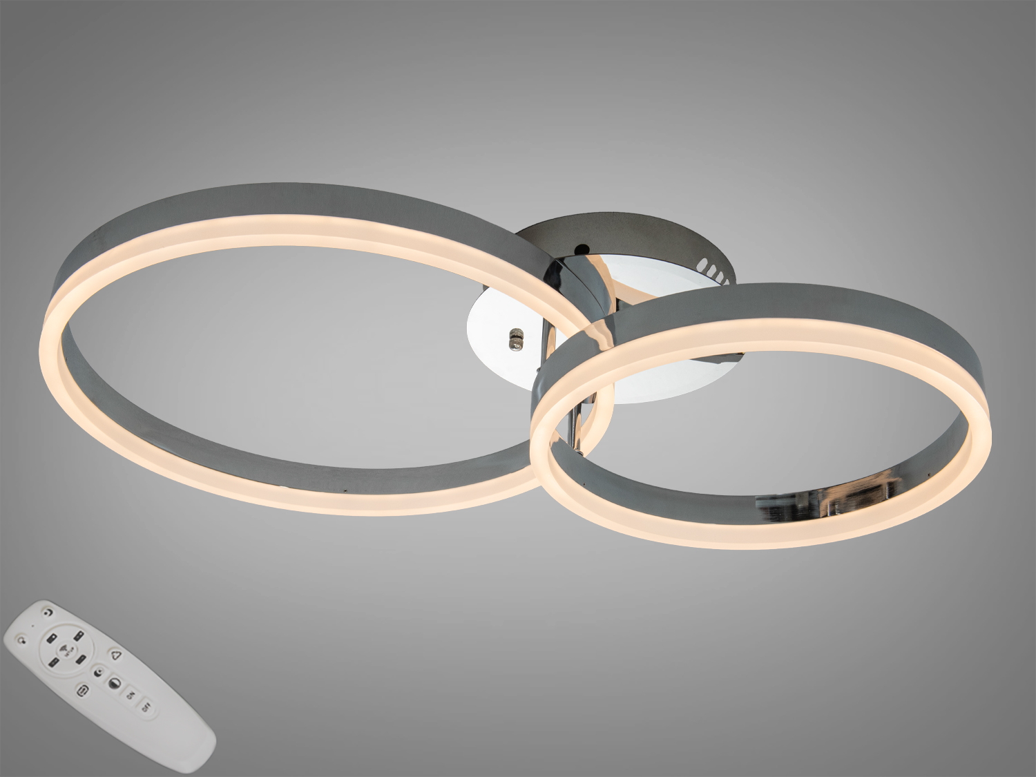 Потолочна LED люстра з хромованою основою та двома великими світлодіодними кільцями, що перетинаються, створює сучасний акцент у приміщенні. Ця модель поєднує стильний дизайн із функціональністю, пропонуючи регулювання яскравості та кольору світла за допомогою пульта дистанційного керування. Вбудовані LED-елементи забезпечують рівномірне, холодне біле світло, що комфортно розсіюється кімнатою.