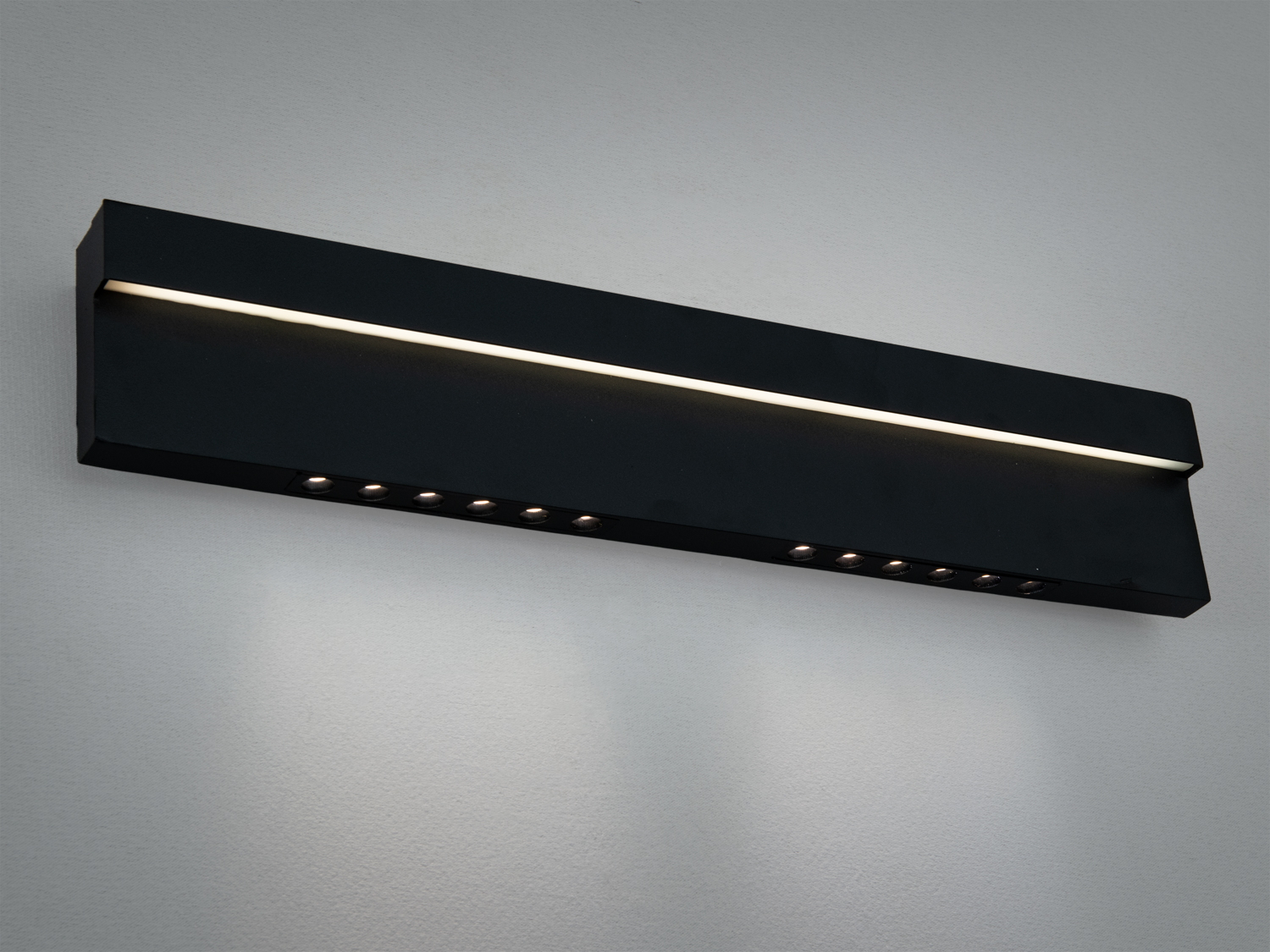 Виріб виготовлений з міцного металу з матовим чорним покриттям, що надає йому сучасний та мінімалістичний вигляд. Висота бра становить 8 см, а довжина — 42 см. Воно відступає від стіни лише на 4 см, що робить його практично непомітним.