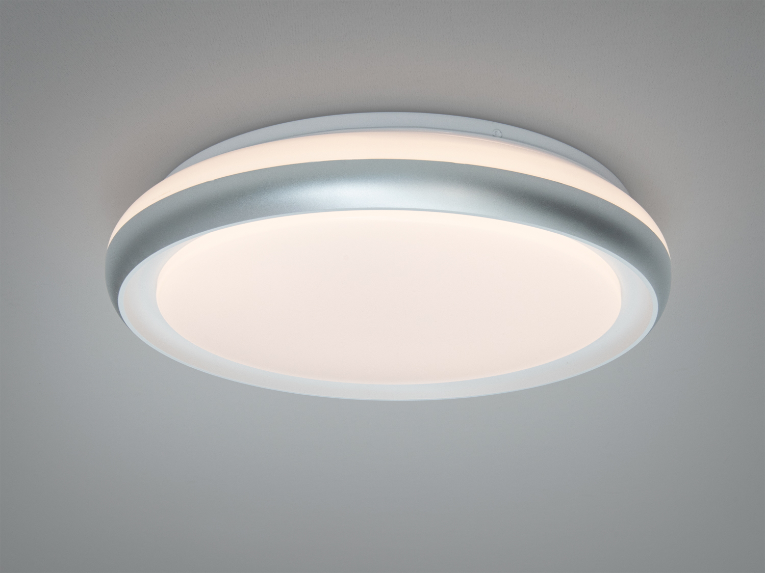Люстра виконана у сучасному дизайні з білою основою та сірими вставками, що дозволяє їй гармонійно вписуватися в будь-який інтер'єр. Матове акрилове розсіювач рівномірно розсіює світло, зменшуючи контрастність тіней та створюючи м'яке освітлення.