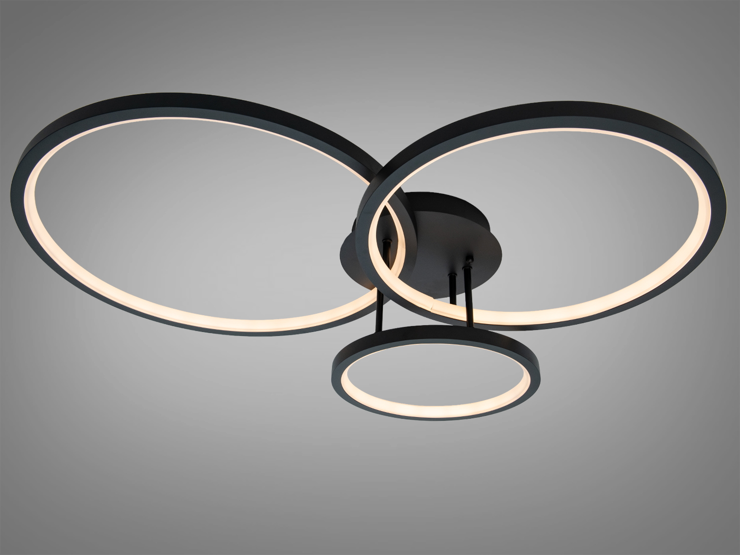 Ключові особливості цієї моделі включають три світлові кільця, які утворюють геометричну композицію, рівномірно розподіляючи світло по всій кімнаті. Чорний металевий каркас підкреслює сучасний стиль і легко поєднується з різними інтер'єрами.