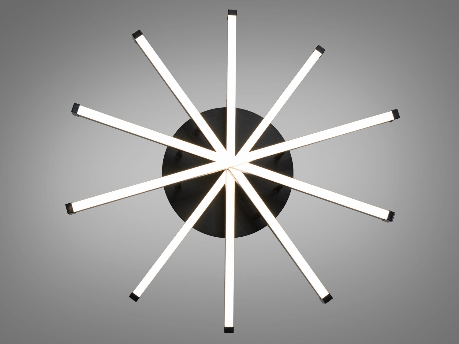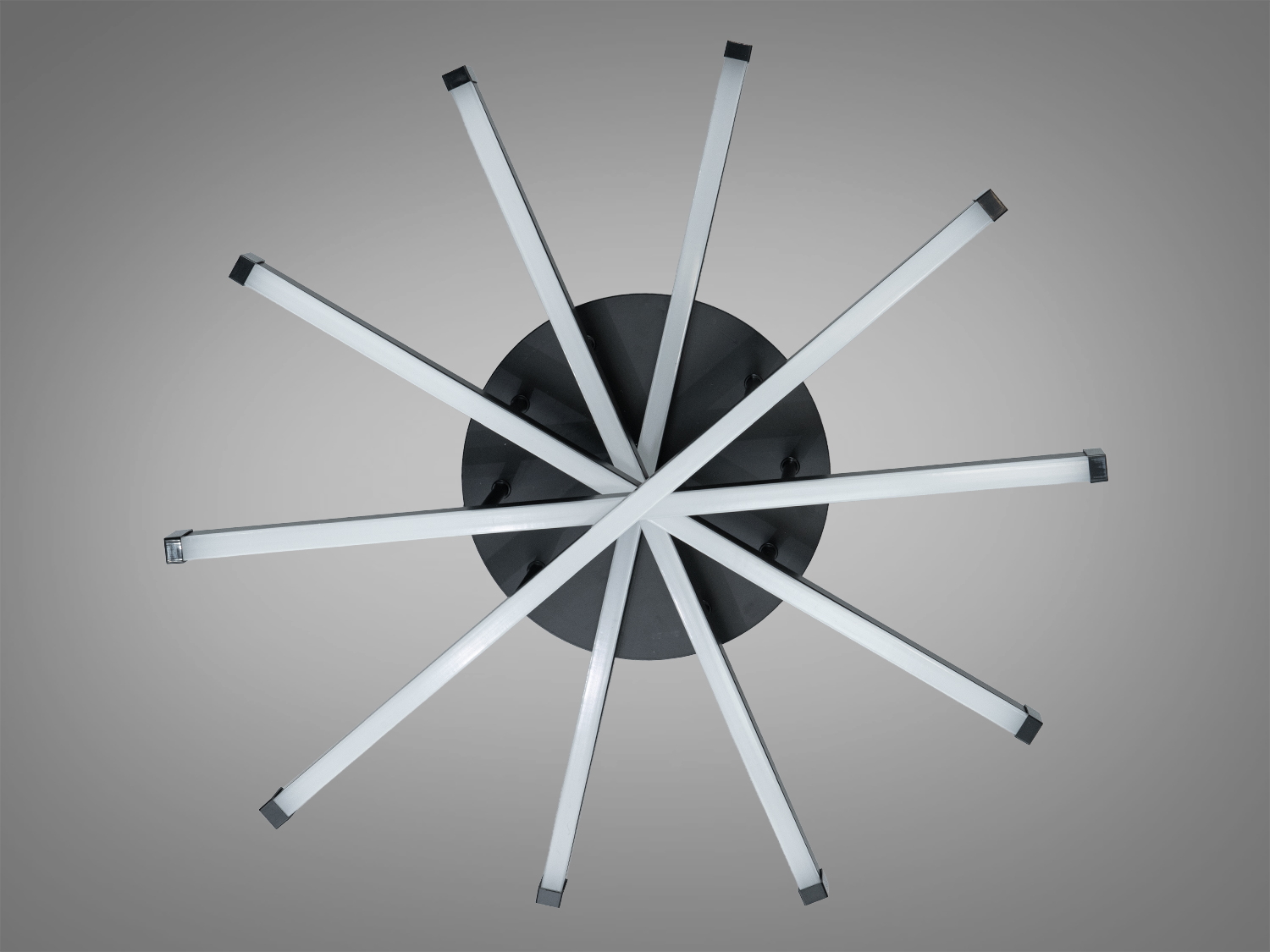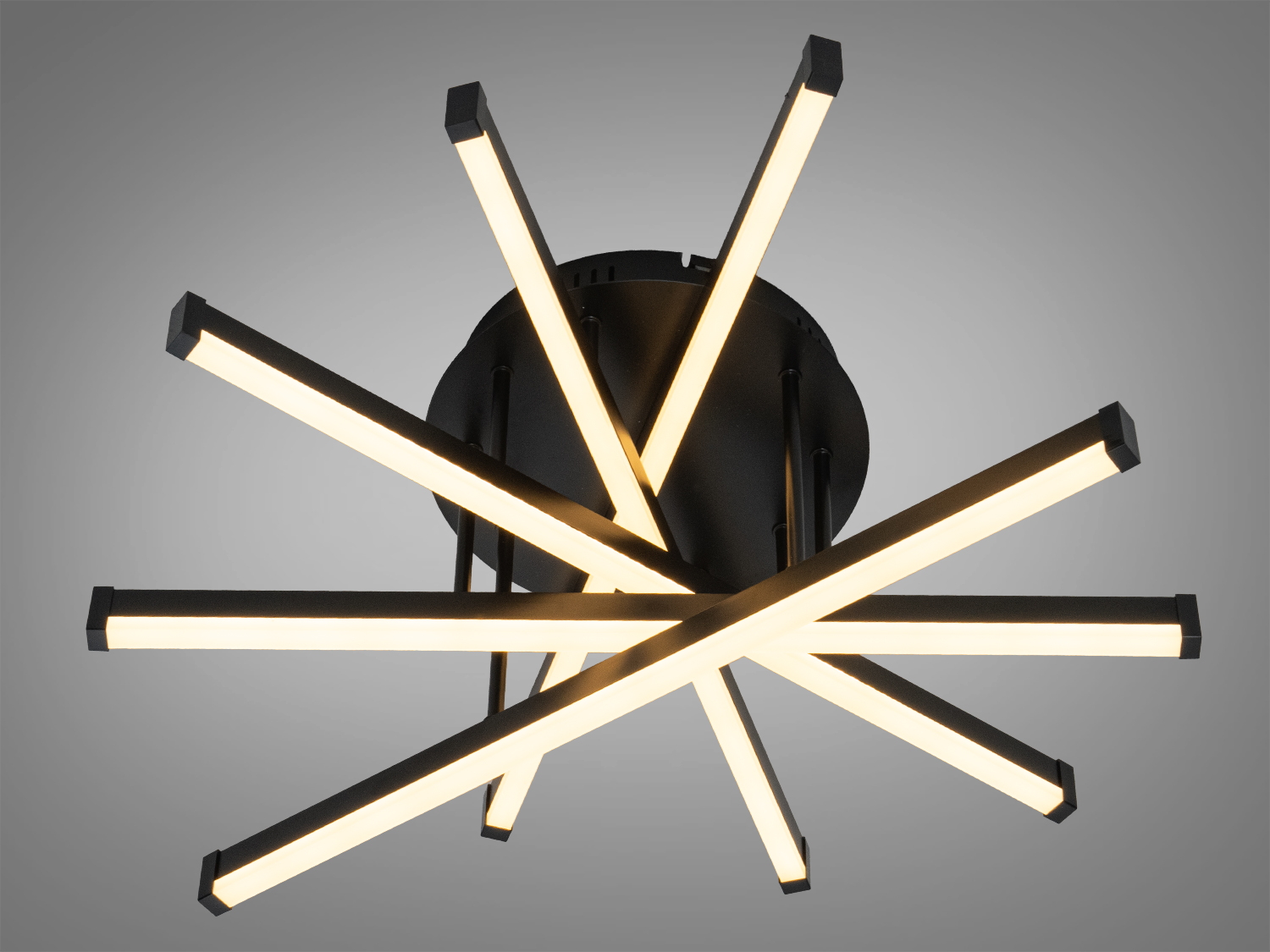 Металевий каркас з акриловими розсіювачами сприяє м'якому розподілу світла, а сучасний дизайн чорного кольору дозволяє люстрі гармонійно вписатися в інтер'єри у стилі мінімалізм, модерн або лофт.