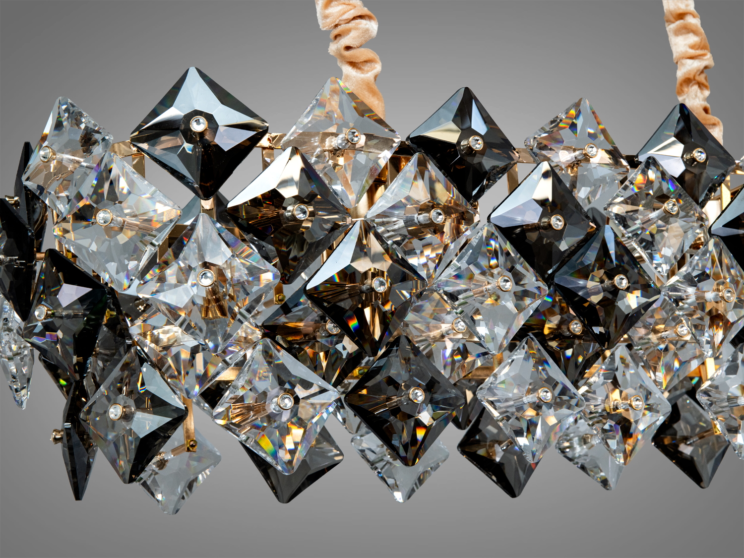 Тканинний підвіс візуально пом'якшує конструкцію та вписується в інтер'єри з теплою колірною гамою. Золота металева база забезпечує надійне й естетичне кріплення до стелі.
