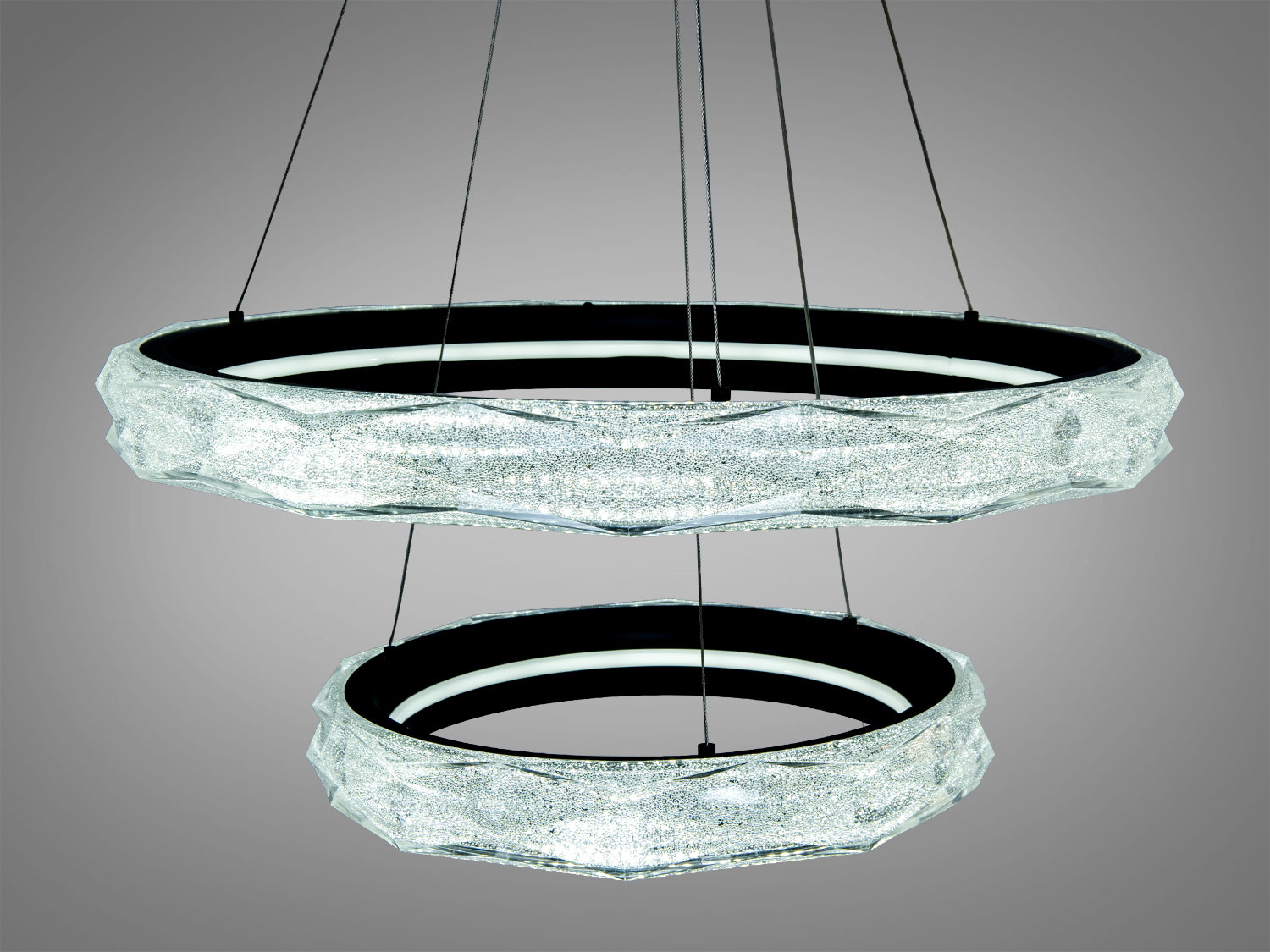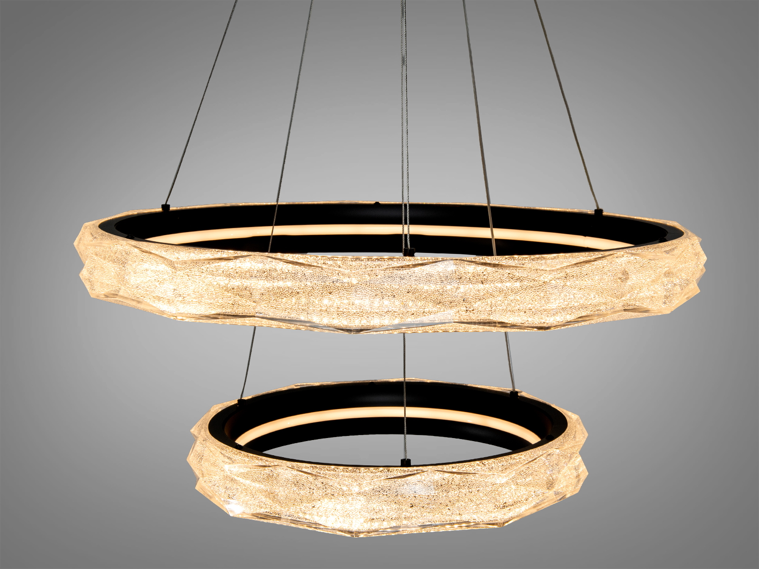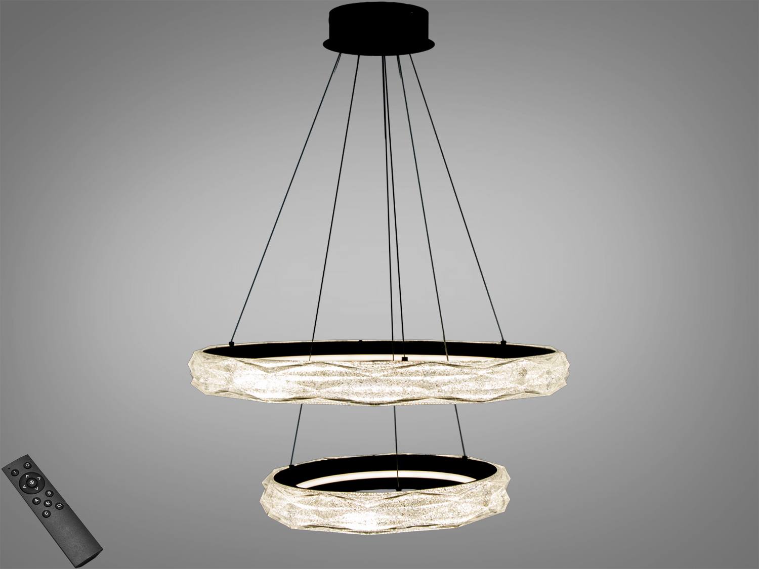 Люстра підходить для різних приміщень: від вітальні до кухні. Елегантний дизайн двох кілець формує багатошарову світлову композицію, рівномірно розподіляючи світло по кімнаті.