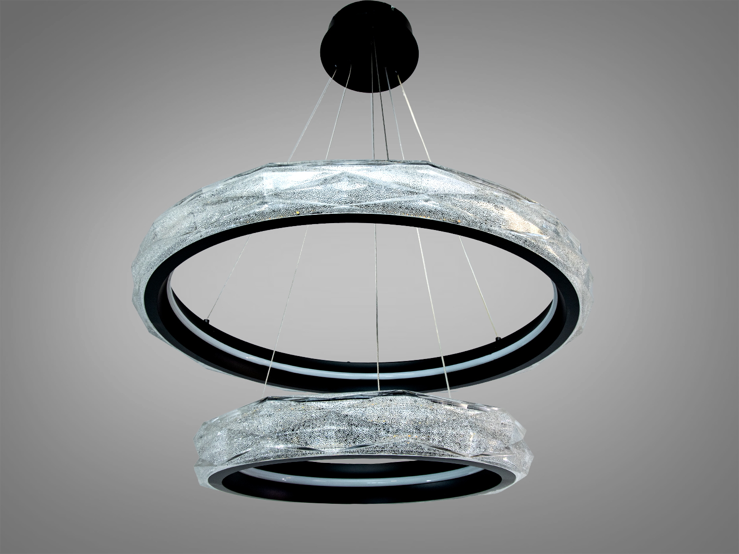 Підвісна люстра Diasha — це рішення для сучасного інтер'єру. З двома кільцями, виконаними у чорному кольорі, вона створює виразний акцент у будь-якому приміщенні.