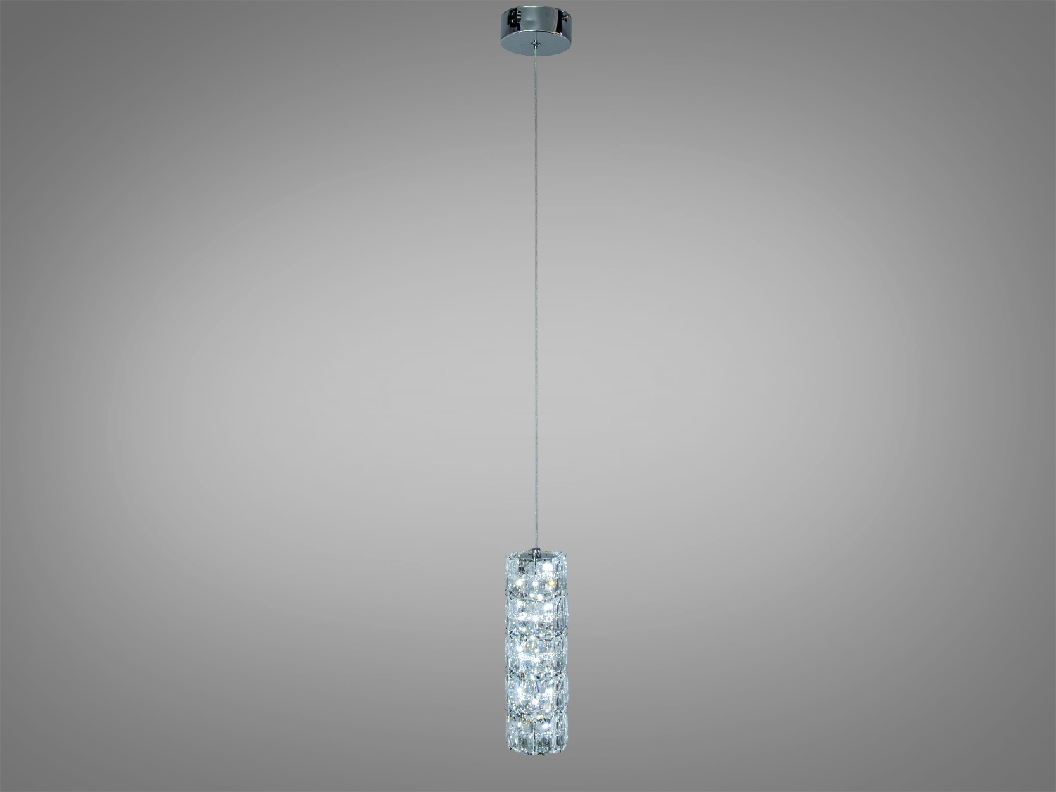 Підвіс виконаний у формі циліндра з гранованими кришталевими елементами, що підсилює світловий потік і створює ефект легкості. Хромоване оздоблення каркасу підкреслює глибину кристалів і надає виробу сучасний вигляд.