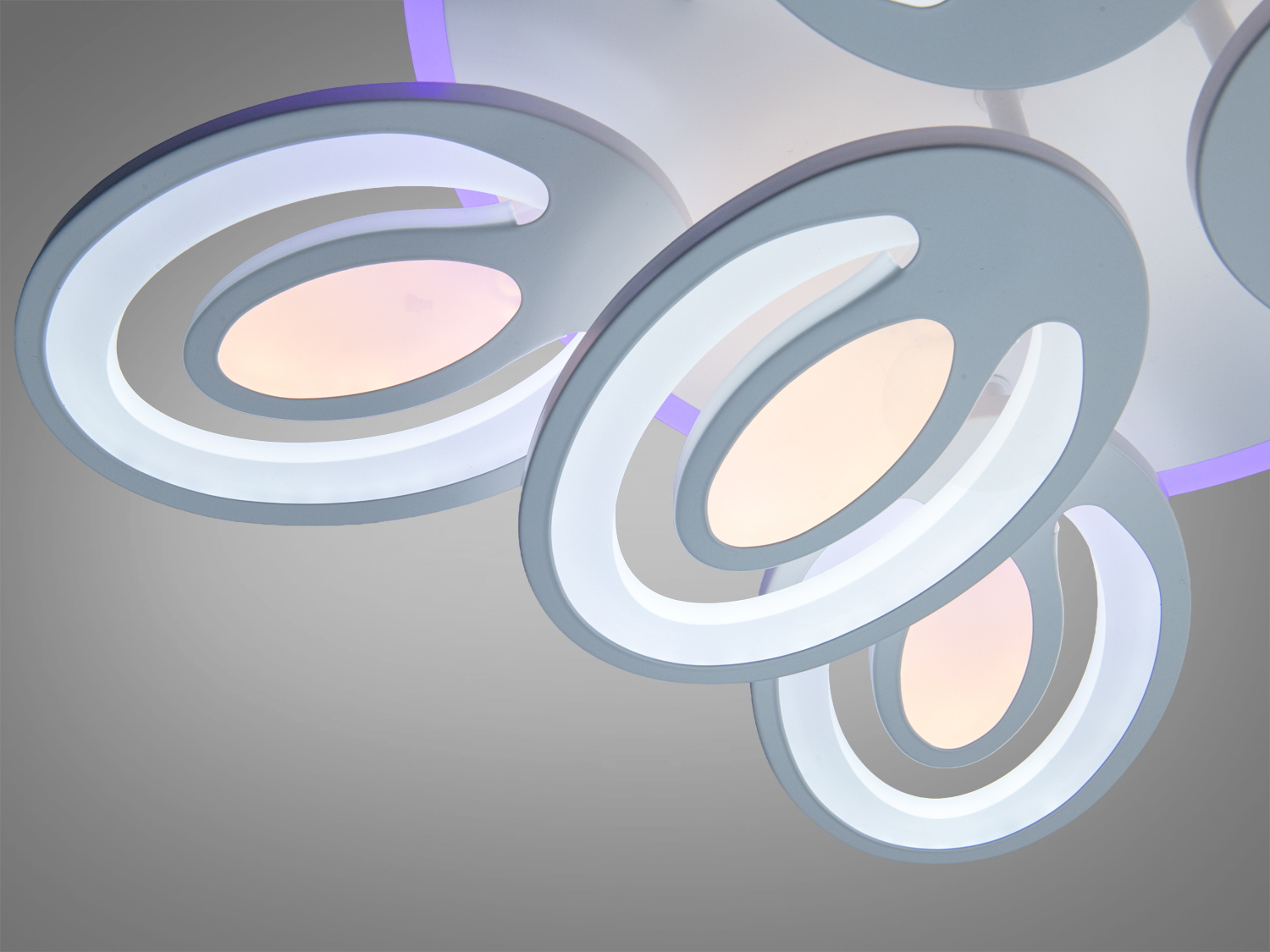 Люстра виконана в білому кольорі, що дозволяє їй гармонійно вписатися в будь-який інтер'єр. Металевий каркас забезпечує надійність конструкції, а акрилові розсіювачі створюють м’яке та рівномірне світіння, виключаючи різкі відблиски. Накладний монтаж дозволяє економити простір, що робить її підходячою для приміщень з низькими стелями.