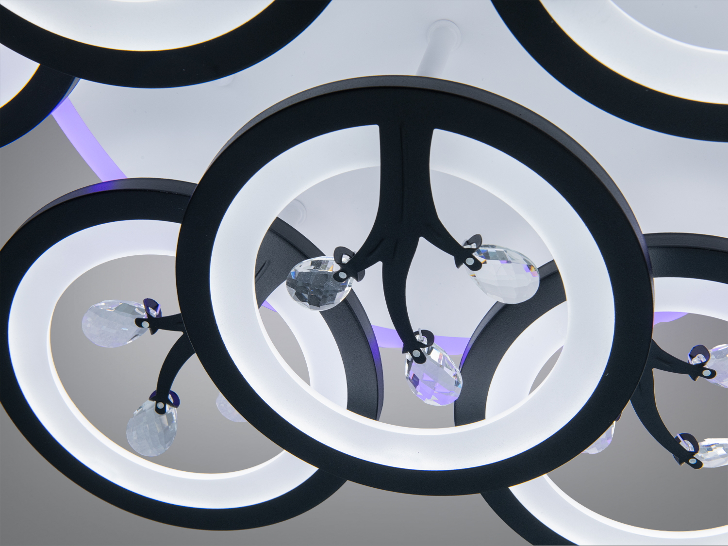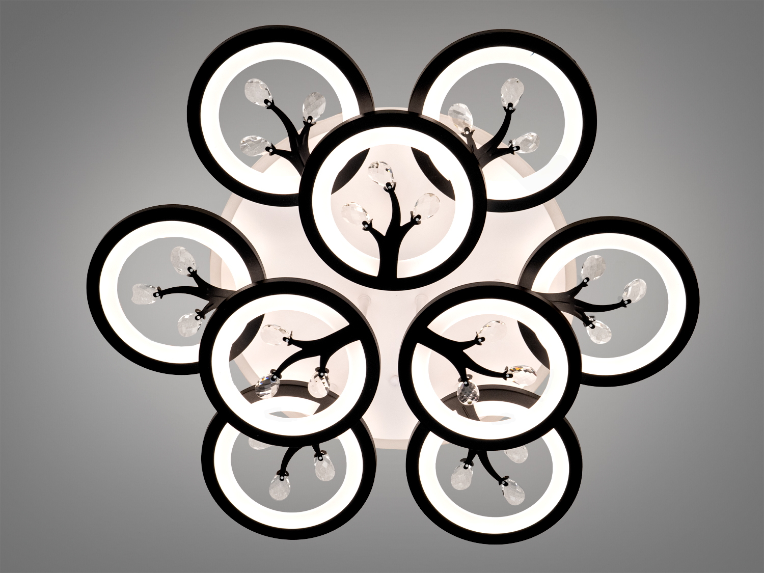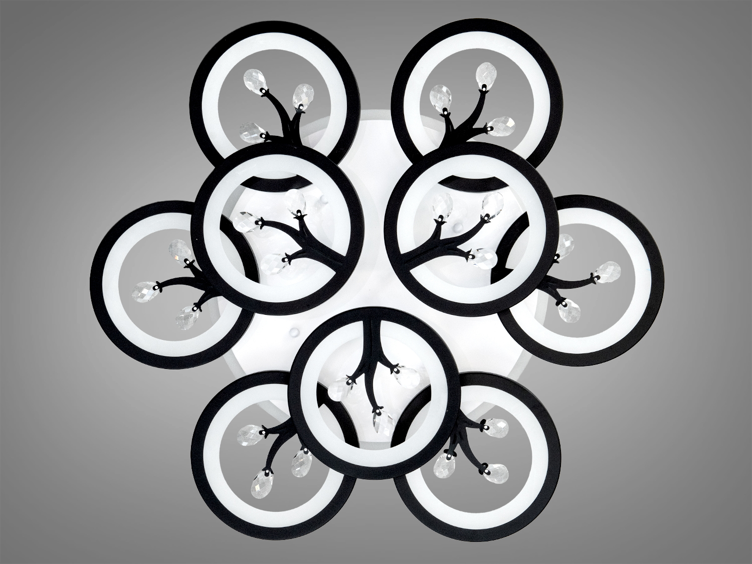 Стельова LED люстра потужністю 140 Вт є стильним рішенням для сучасних інтер'єрів. Ця модель, виконана в чорному кольорі, оснащена дев'ятьма кільцевими світловими модулями. Кільця з декоративними кристалами створюють вишукані відблиски, підкреслюючи графічну форму люстри. Металевий каркас та акрилові розсіювачі забезпечують рівномірне м'яке розподілення світла.