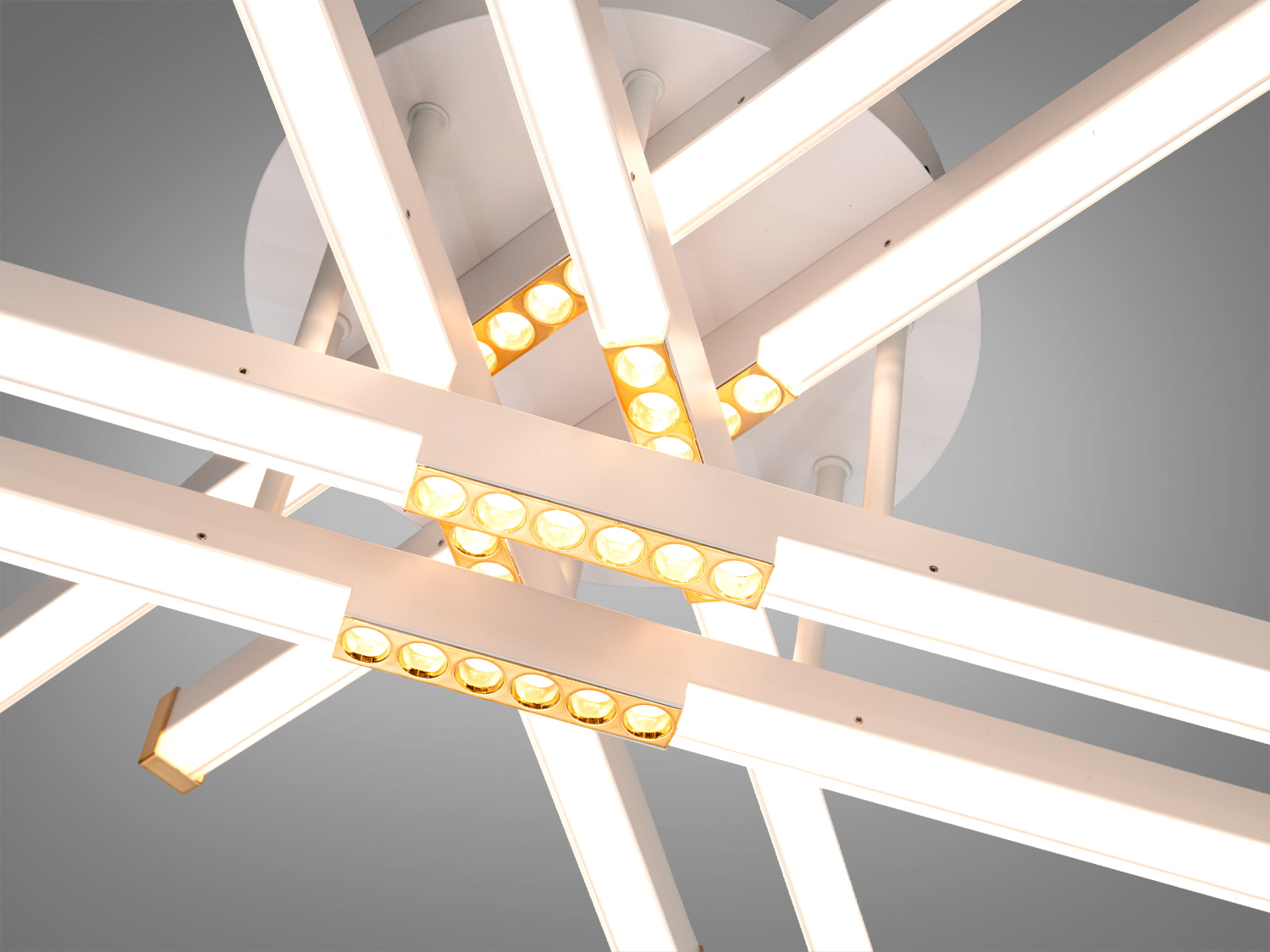 Конструкція з 6 ліній світлових модулів забезпечує рівномірний розподіл світла та створює виразний графічний образ на стелі. Таке розташування дозволяє уникнути різких тіней та створити м'який світловий контур.