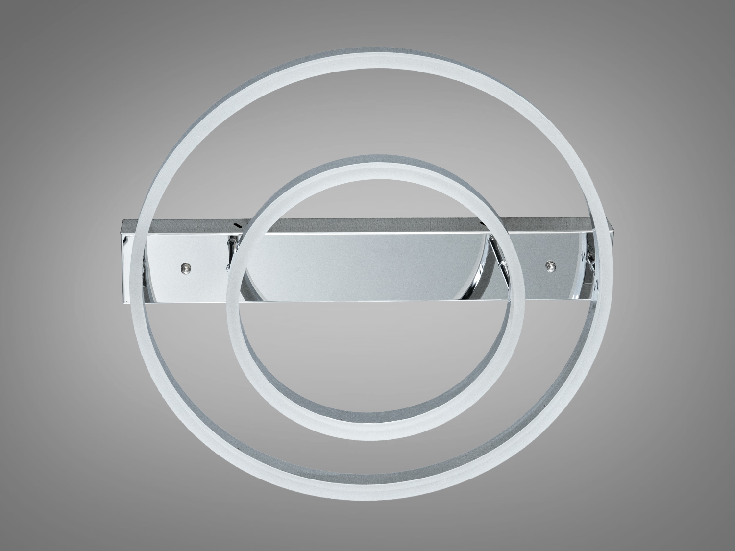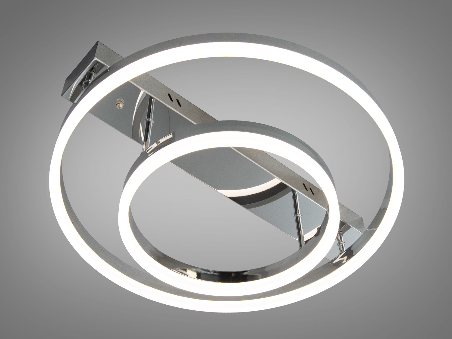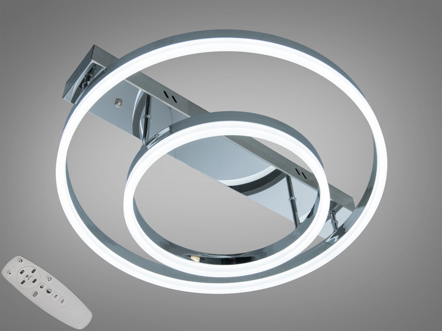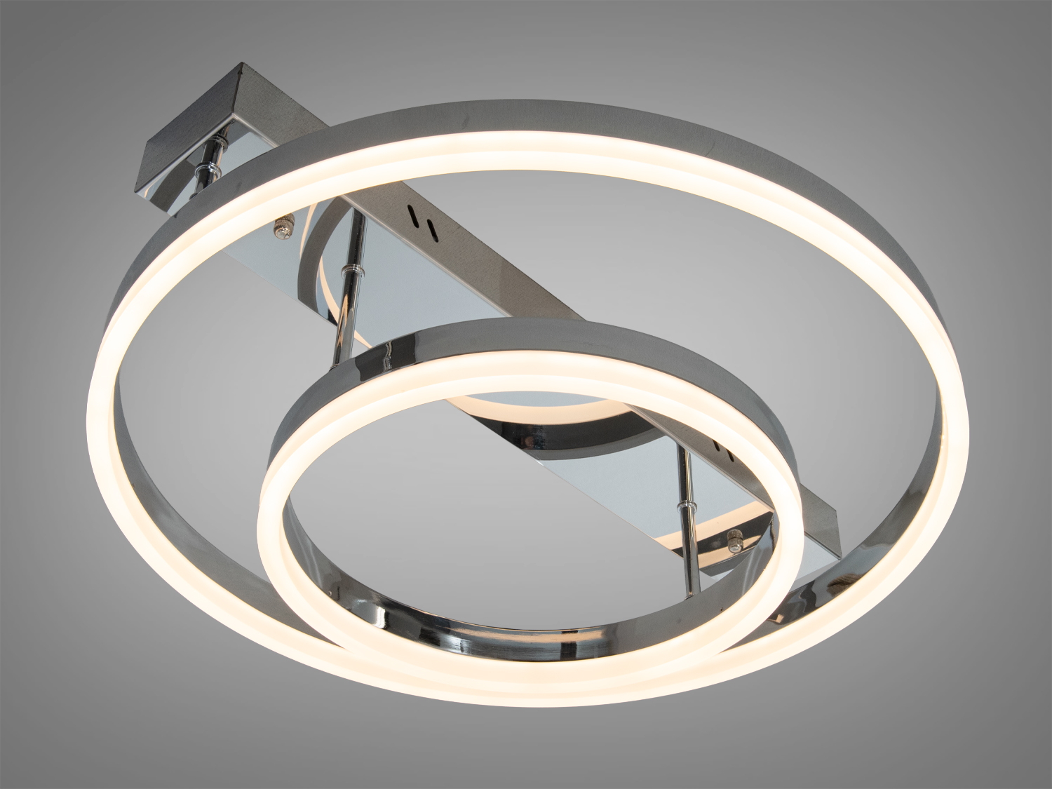 Стельова LED люстра потужністю 60 Вт забезпечує рівномірне освітлення завдяки двом круглим світловим модулям. Вона підходить для невеликих і середніх приміщень, таких як спальні, вітальні чи офіси. Люстра виконана у сучасному хромованому дизайні, що легко вливається у мінімалістичні інтер'єри.