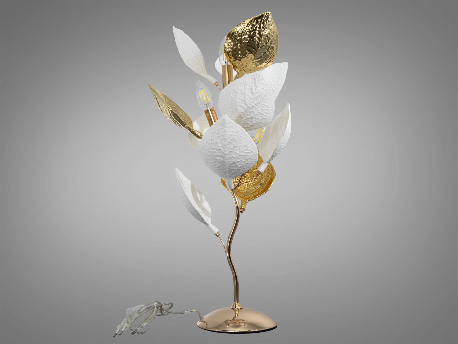 Елегантна настільна лампа, виконана у вигляді листя, стане вишуканим акцентом у вашому інтер'єрі. Золотисте покриття надає теплоту та витонченість, а матові білі плафони створюють м'яке та приємне світло. Лампа оснащена трьома патронами E14, що забезпечує рівномірне освітлення простору.