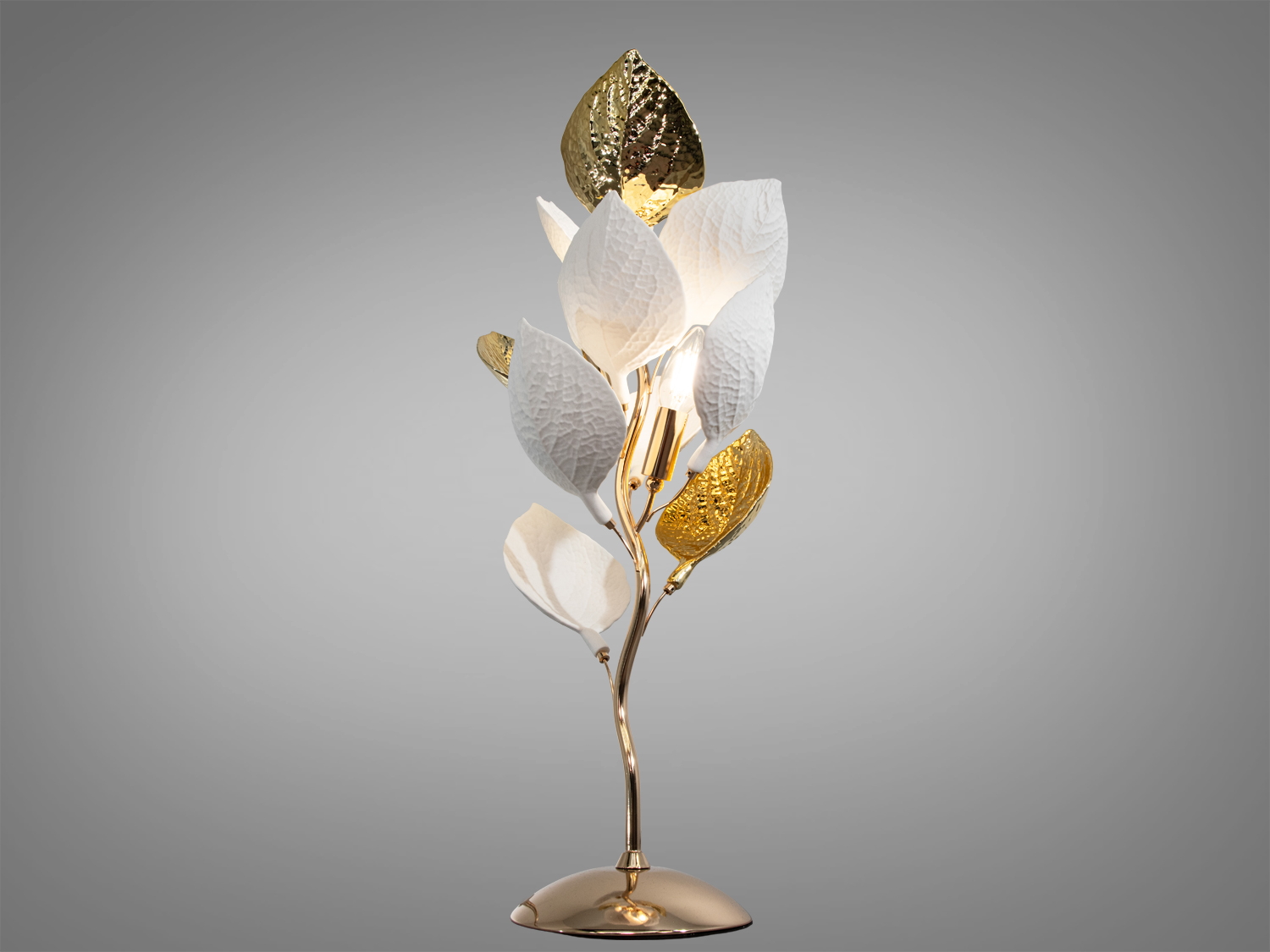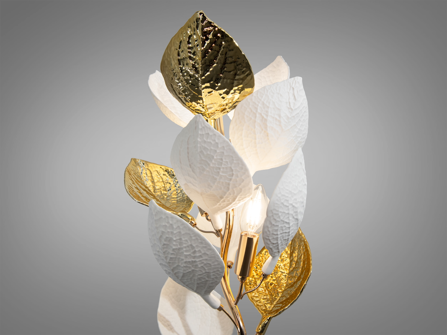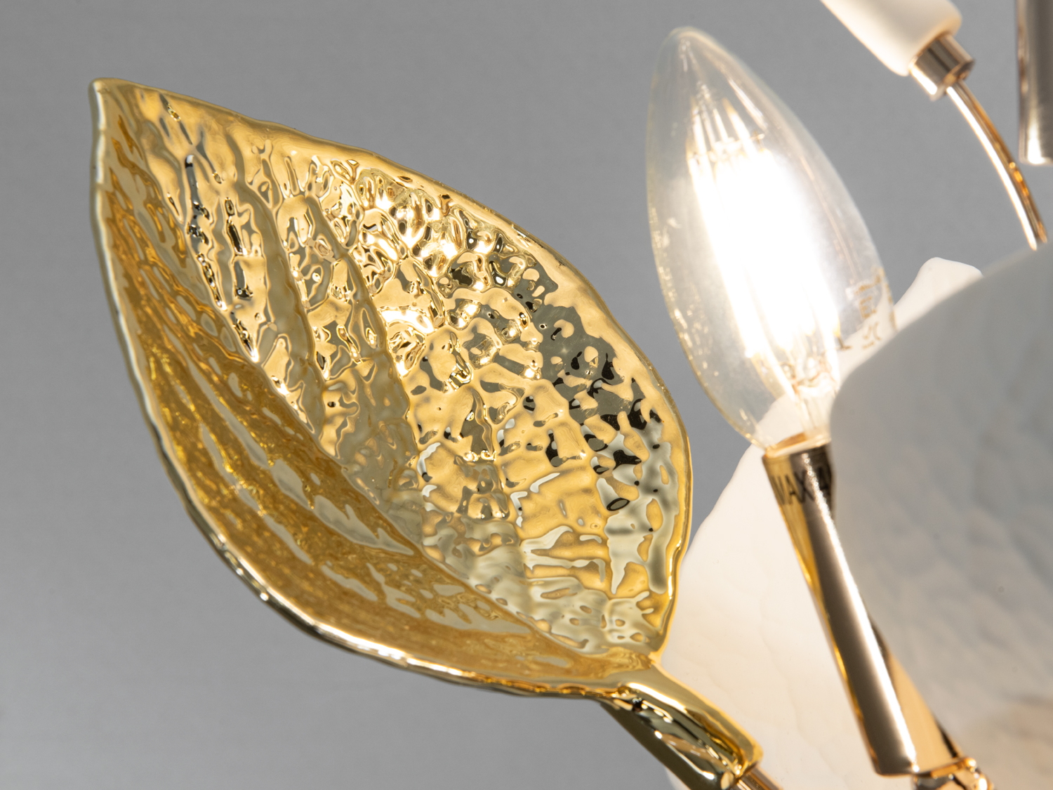Дизайн у ботанічному стилі з елементами золота легко вписується в сучасні та класичні інтер'єри. Лампа здатна підкреслити текстуру вашого декору та створити затишне вечірнє освітлення без різких тіней.
