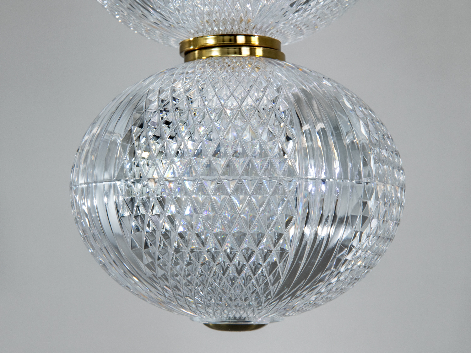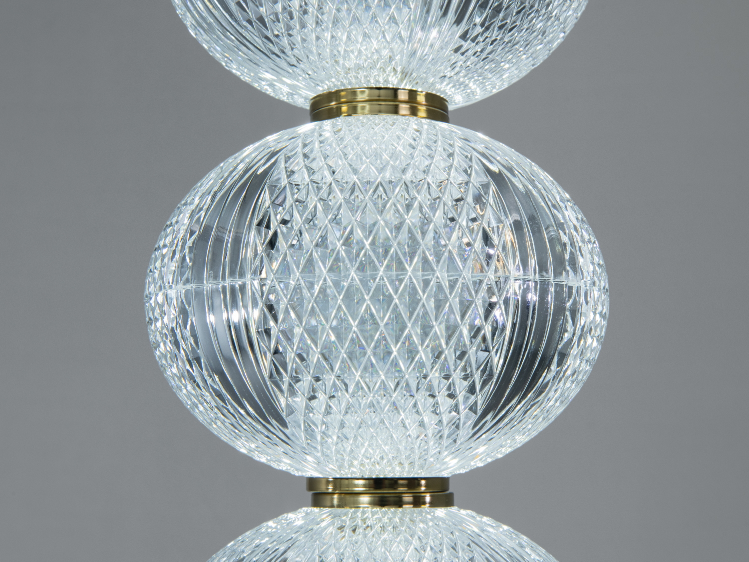 Підвіс виконаний з якісного металу з золотим покриттям, що надає йому розкішного вигляду. Його висота регулюється від 70 до 200 см, що дозволяє адаптувати світильник під будь-які умови та вподобання.