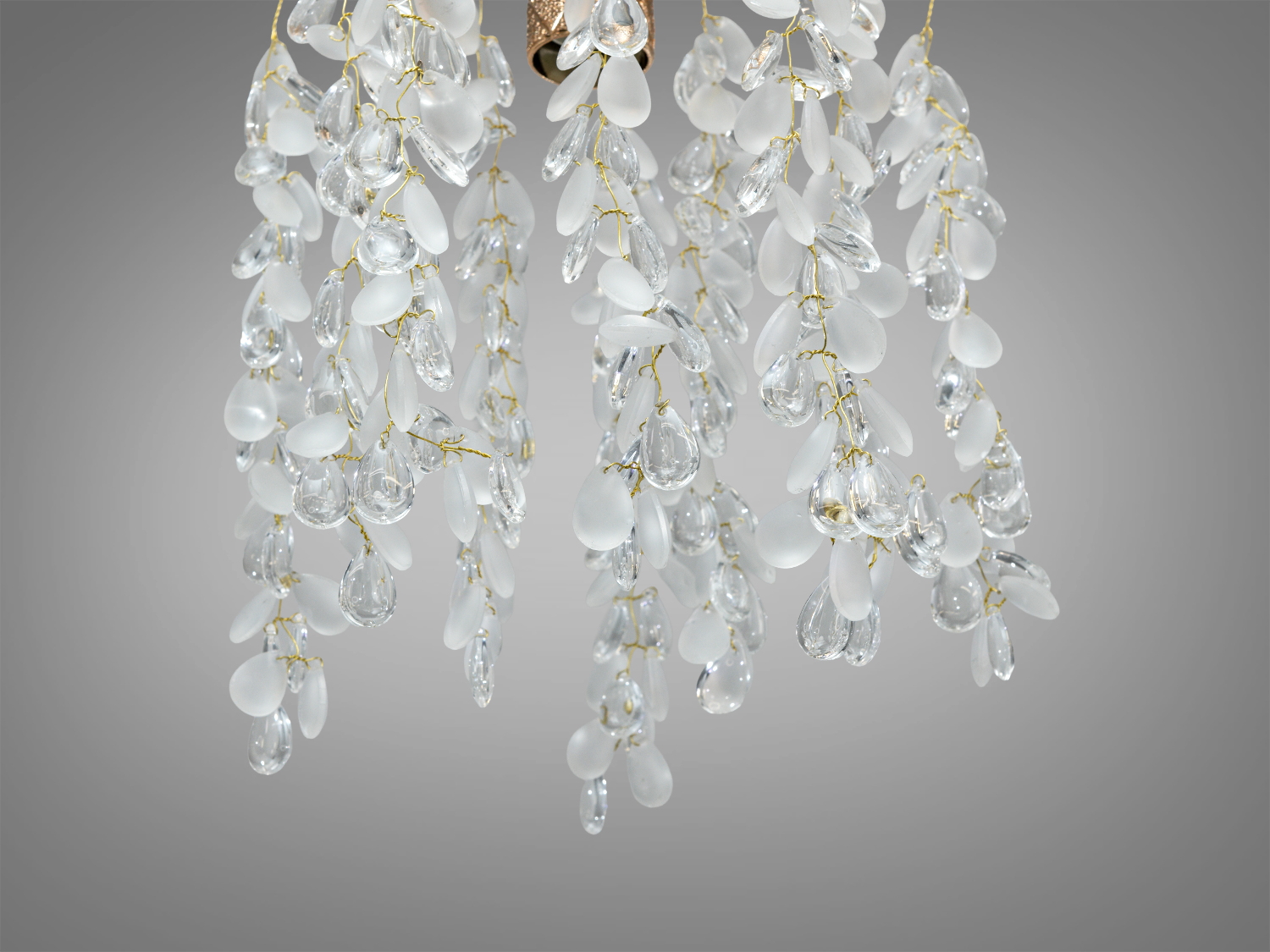 Підвісна люстра Гліцинія — це вишукане рішення для тих, хто цінує витонченість і стиль в інтер'єрі. Виріб виконано в золотистому кольорі з кришталевими елементами, що створюють ніжні світлові акценти в приміщенні. Основний матеріал каркасу — метал, покритий гальванікою, що забезпечує довговічність і стійкість до зносу.
