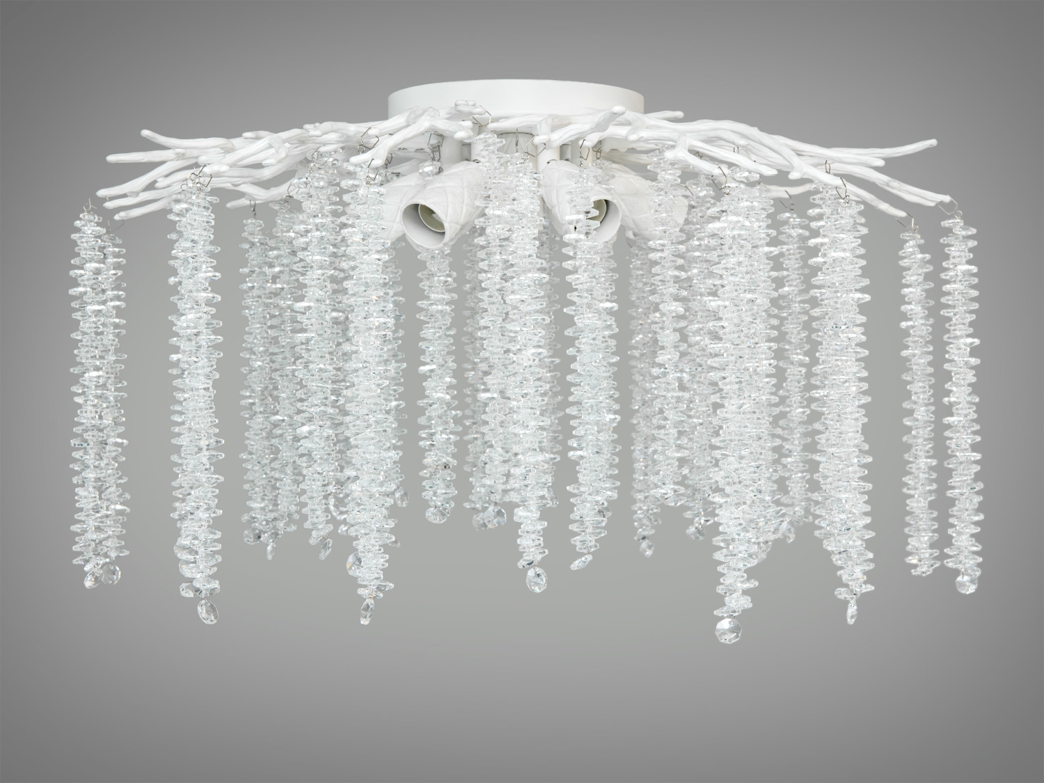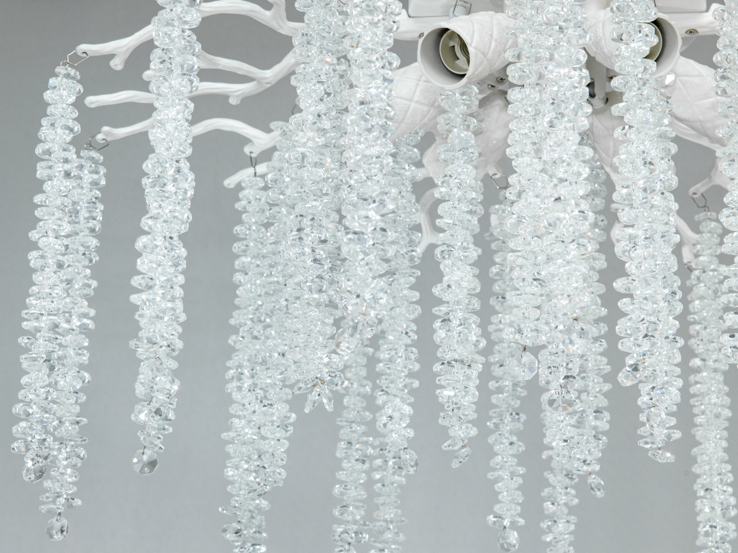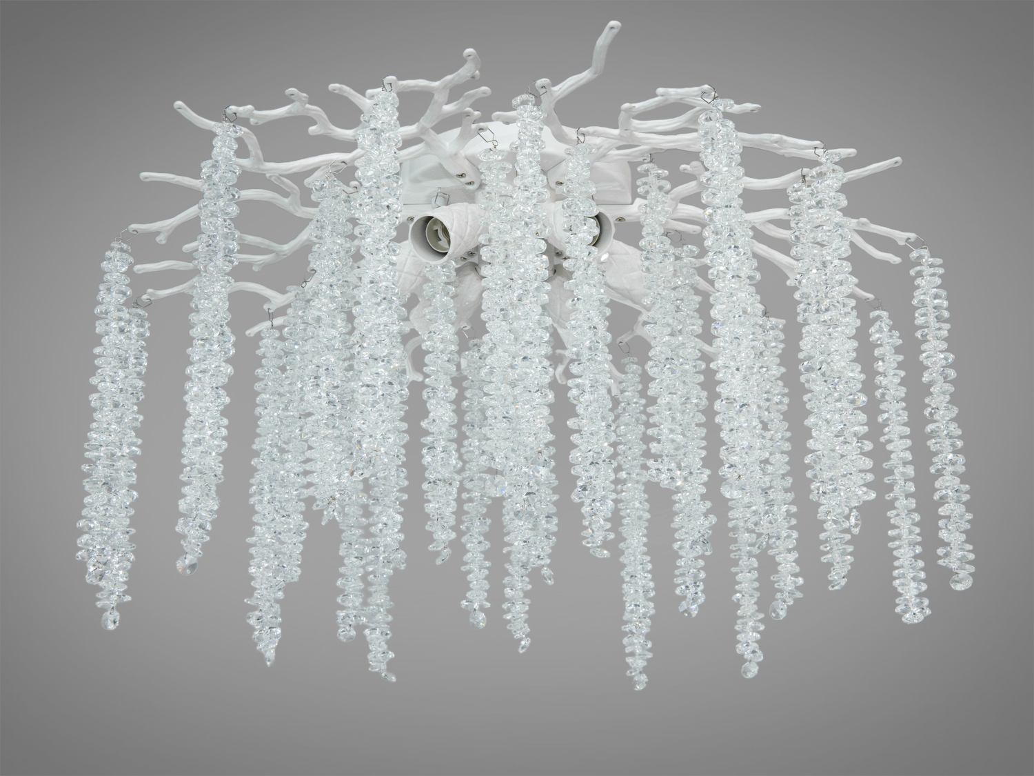 Стельова люстра Гліцинія біла — витончений елемент декору для будь-якої кімнати. Ця люстра підійде для віталень, спалень та інших приміщень площею до 15 м². Її каскадні кришталеві підвіски створюють м'яке сяйво, нагадуючи гірлянди квітів та додаючи елегантності інтер'єру.