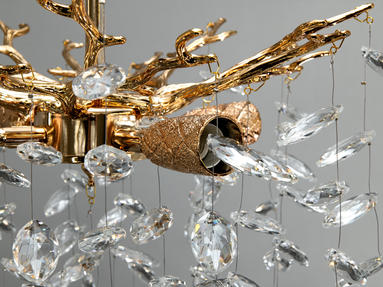 - Кришталеві підвіски у формі крапель і листків заломлюють світло і створюють мерехтливі відблиски.