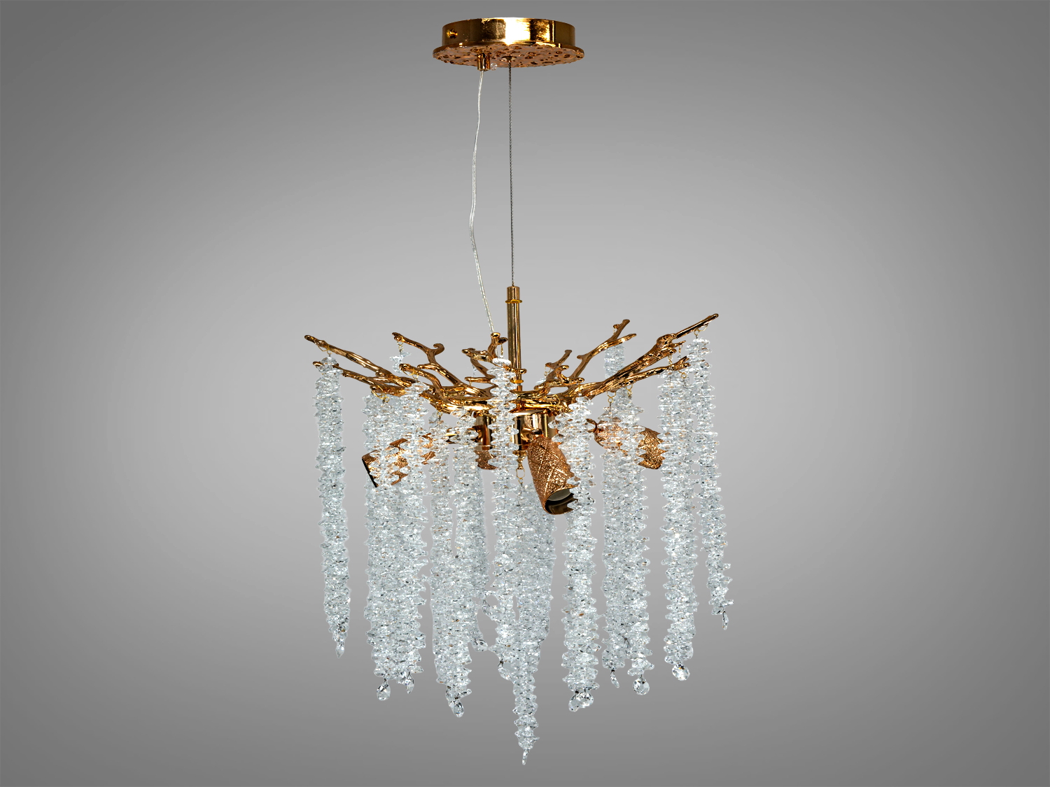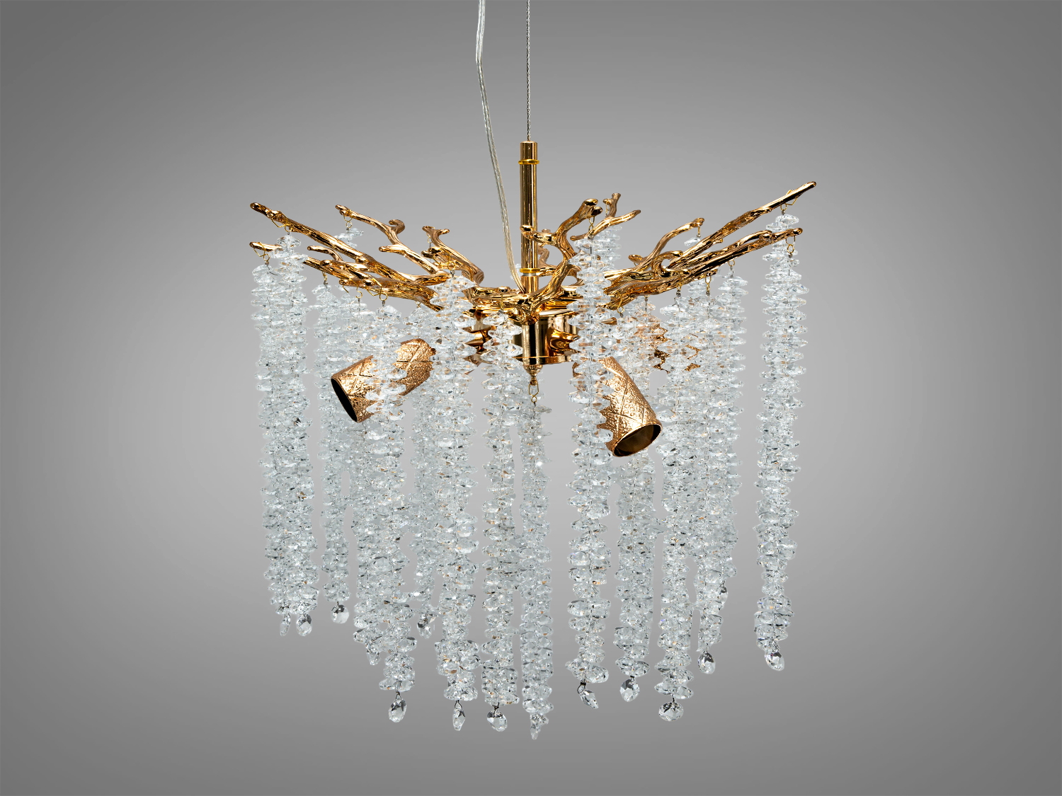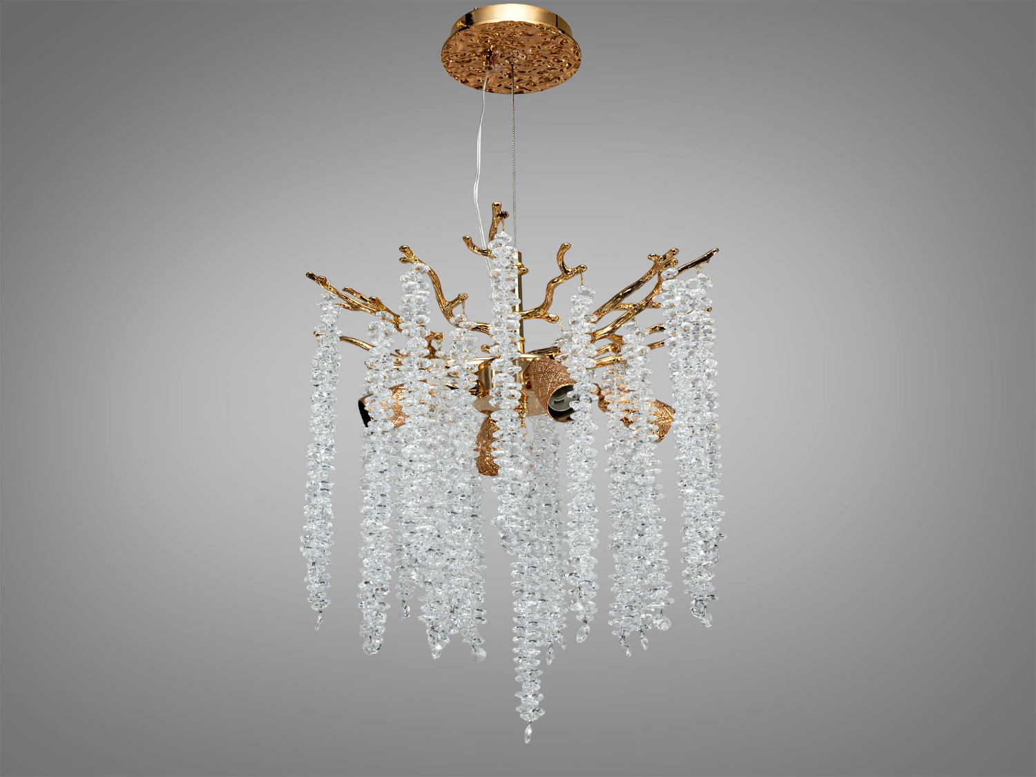 Підвісна люстра Гліцинія у золотому кольорі стане справжньою окрасою вашого інтер'єру. Поєднання металевого каркасу та кришталевих підвісок створює ефект каскаду, що нагадує природні гілки та листя.