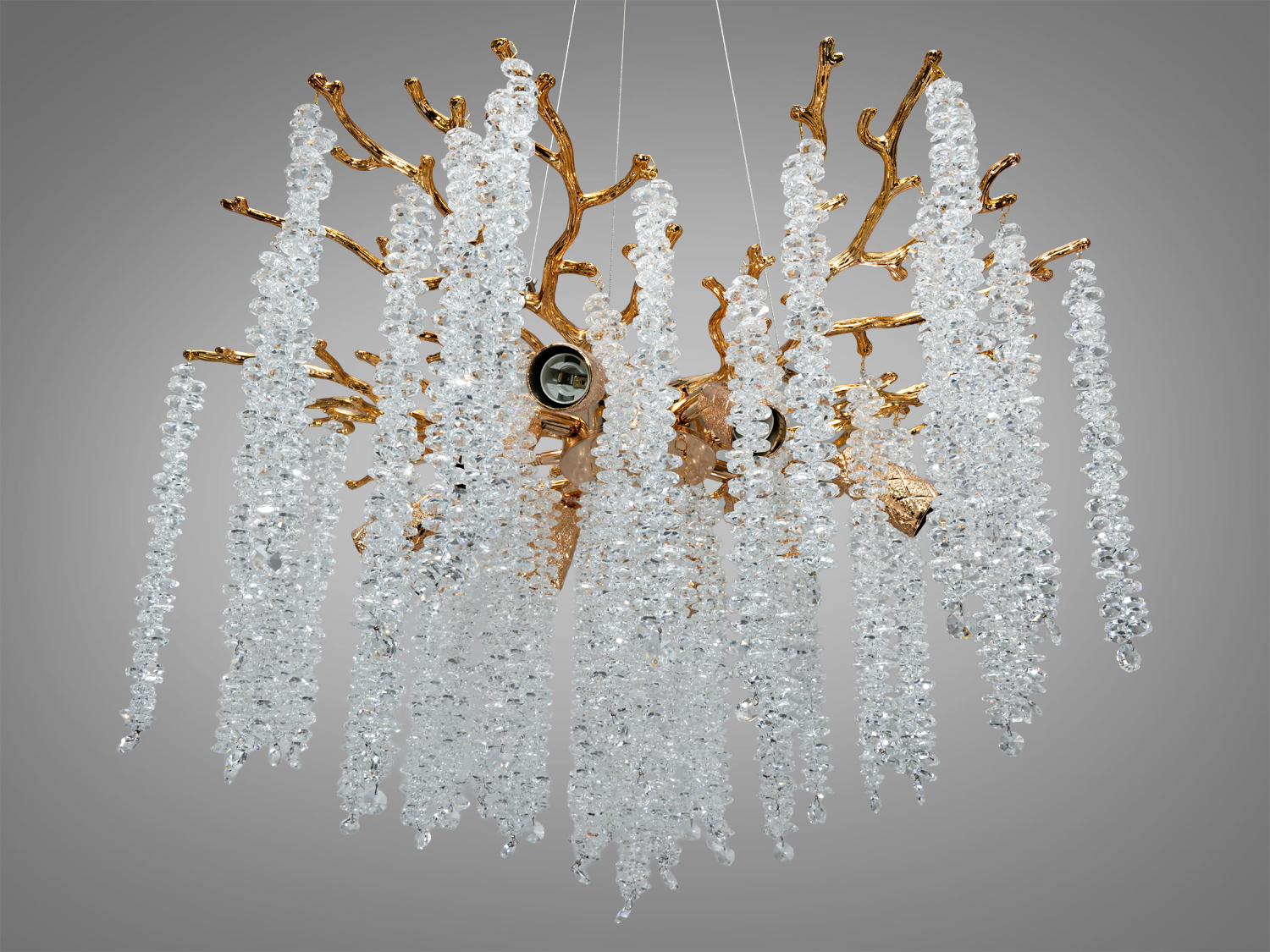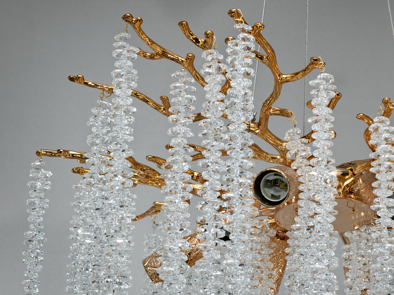 Підвісна кришталева люстра Гліцинія — це вишуканий елемент декору, здатний стати центром уваги у будь-якій кімнаті. Золотий каркас і кришталеві підвіски створюють унікальний візуальний ефект, нагадуючи гілки квітучої гліцинії.