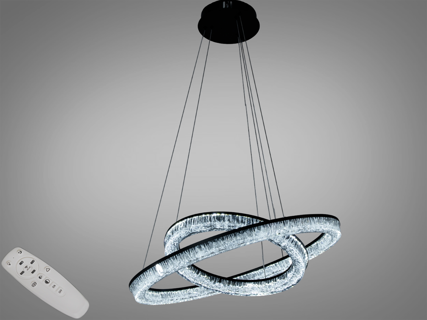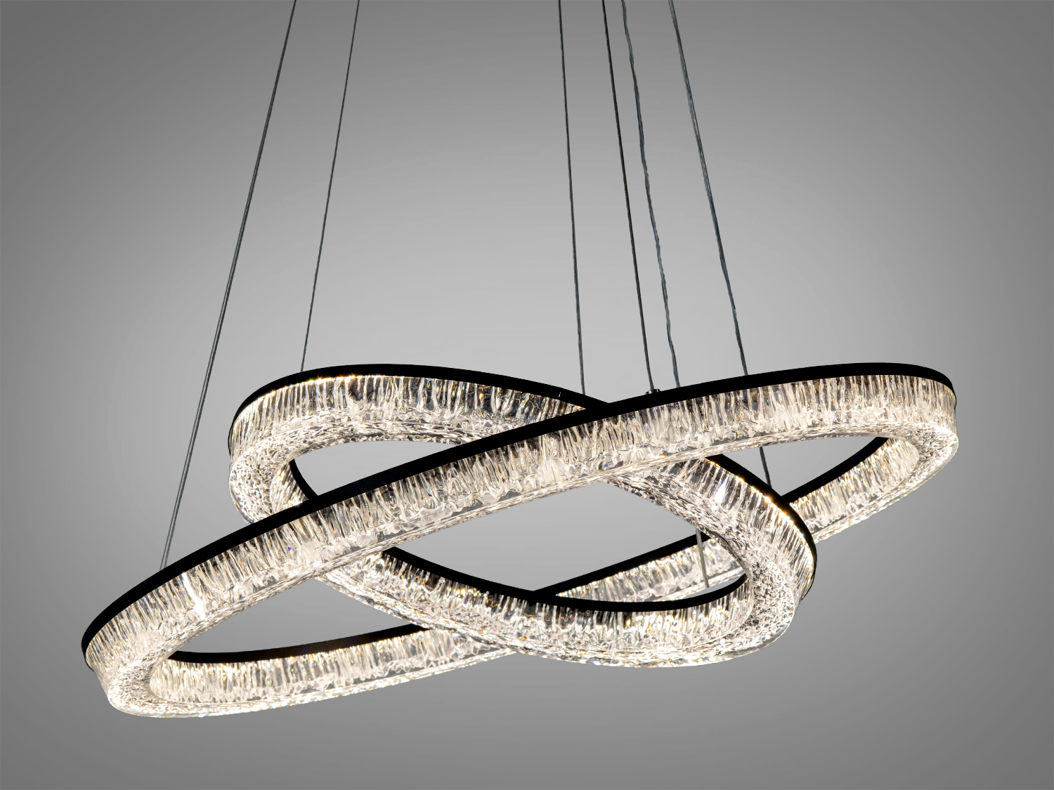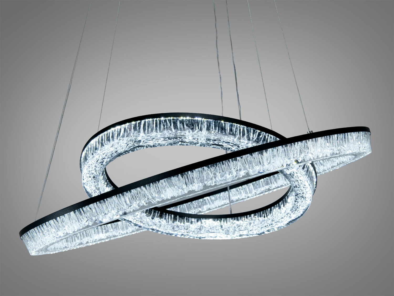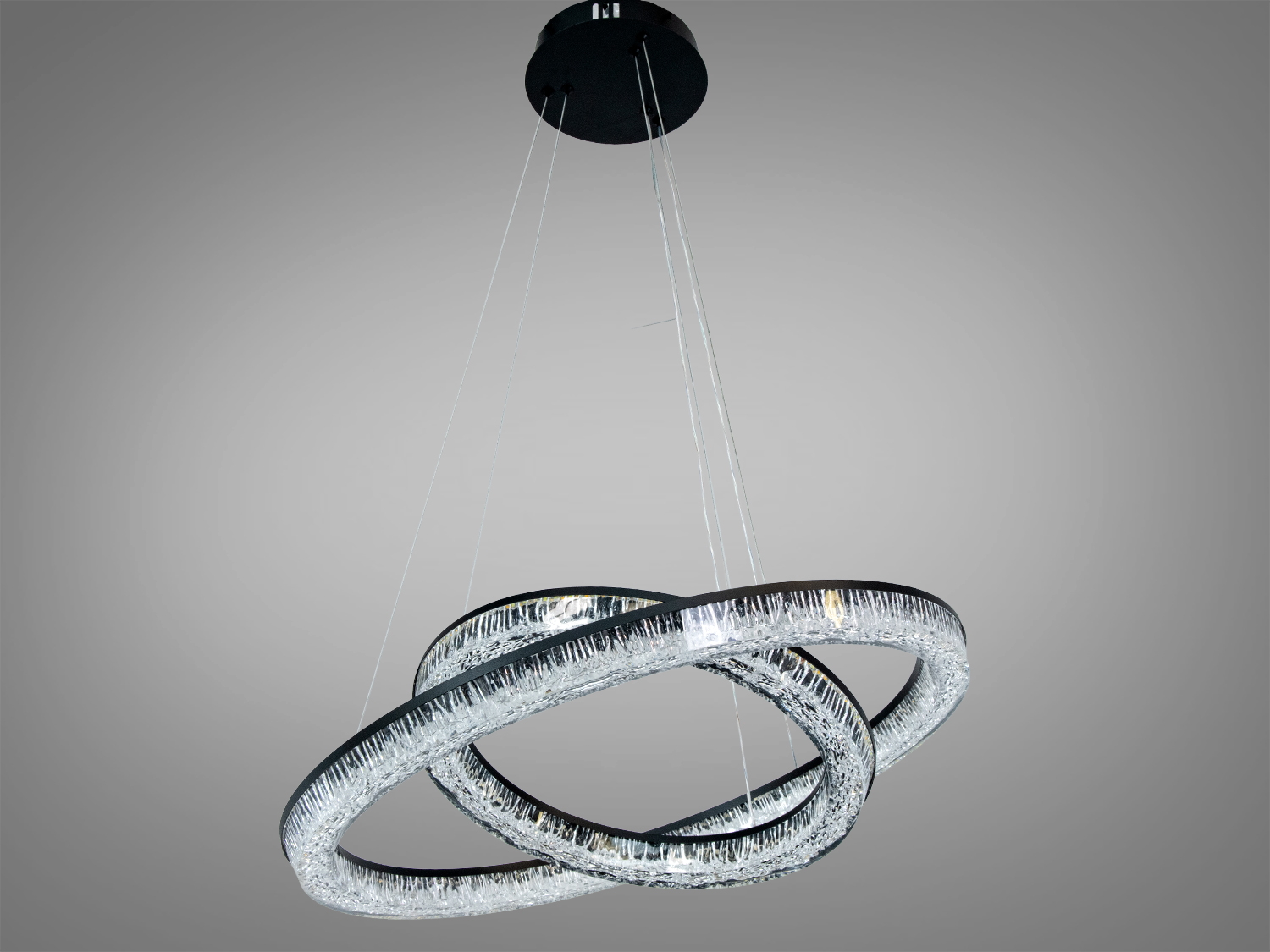 Конструкція люстри включає два переплетених кільця, що створюють унікальний візуальний ефект та рівномірний розподіл світла. Чорний корпус підкреслює вишуканість дизайну, а акрилові розсіювачі м'яко розподіляють світло, уникаючи різких тіней.